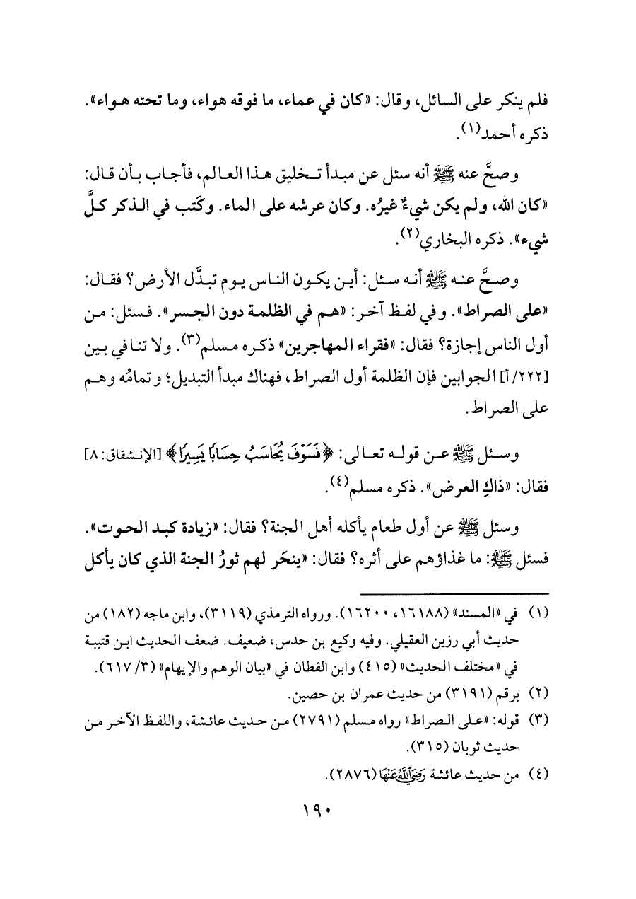 وصحَّ عنه - صلى الله عليه وسلم - أنه سئل: أين يكون الناس يوم تبدَّل الأرض؟ فقال: «على الصراط». وفي لفظ آخر: «هم في الظلمة دون الجسر». فسئل: من أول الناس إجازة؟ فقال: «فقراء المهاجرين» ذكره مسلم (¬٣). ولا تنافي بين [٢٢٢/أ] الجوابين فإن الظلمة أول الصراط، فهناك مبدأ التبديل؛ وتمامُه وهم على الصراط.