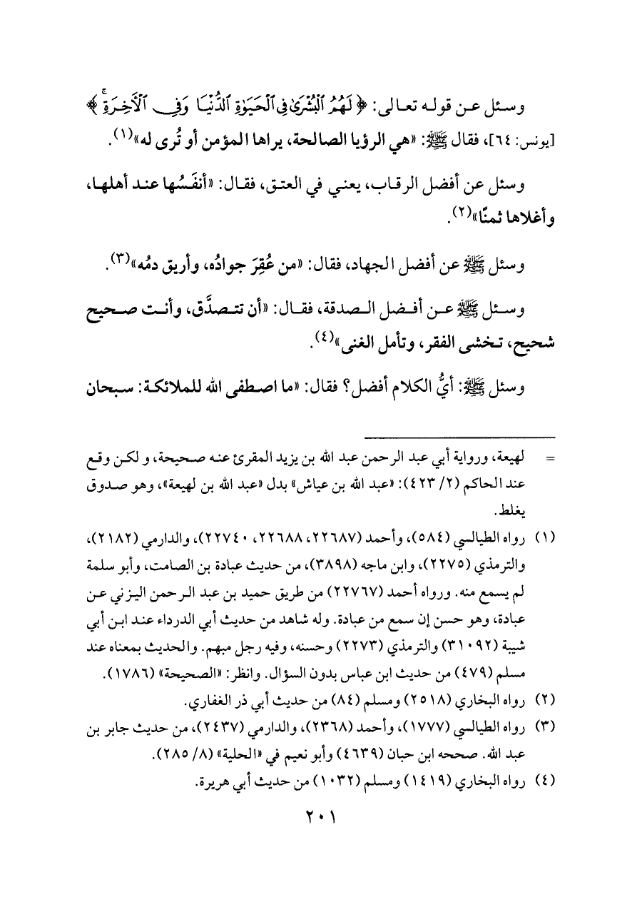 وسئل عن قوله تعالى: {لَهُمُ الْبُشْرَى فِي الْحَيَاةِ الدُّنْيَا وَفِي الْآخِرَةِ} [يونس: ٦٤]، فقال - صلى الله عليه وسلم -: «هي الرؤيا الصالحة، يراها المؤمن أو تُرى له» (¬١).