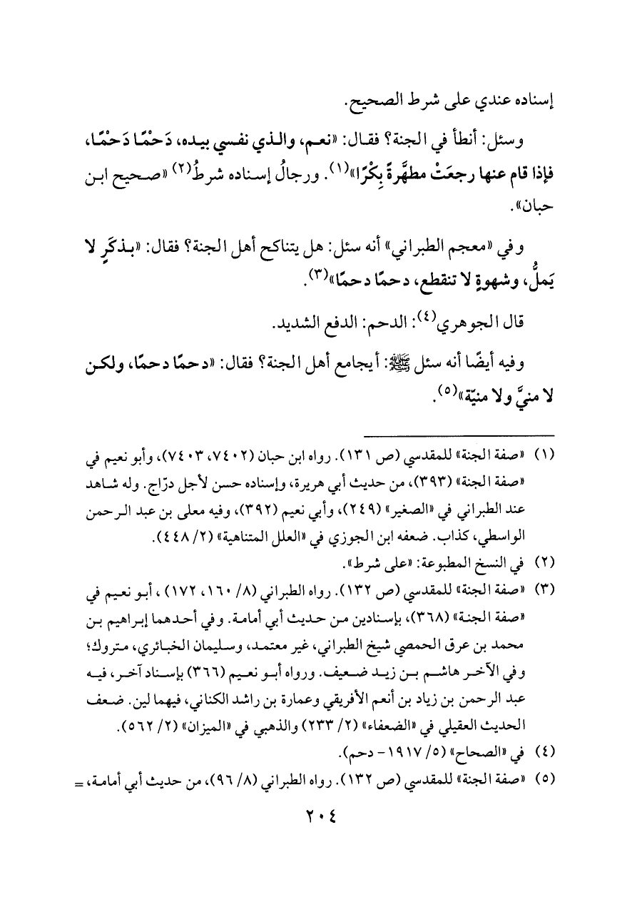 وسئل: أنطأ في الجنة؟ فقال: «نعم، والذي نفسي بيده، دَحْمًا دَحْمًا، فإذا قام عنها رجعَتْ مطهَّرةً بِكْرًا» (¬١). ورجالُ إسناده شرطُ (¬٢) «صحيح ابن حبان».