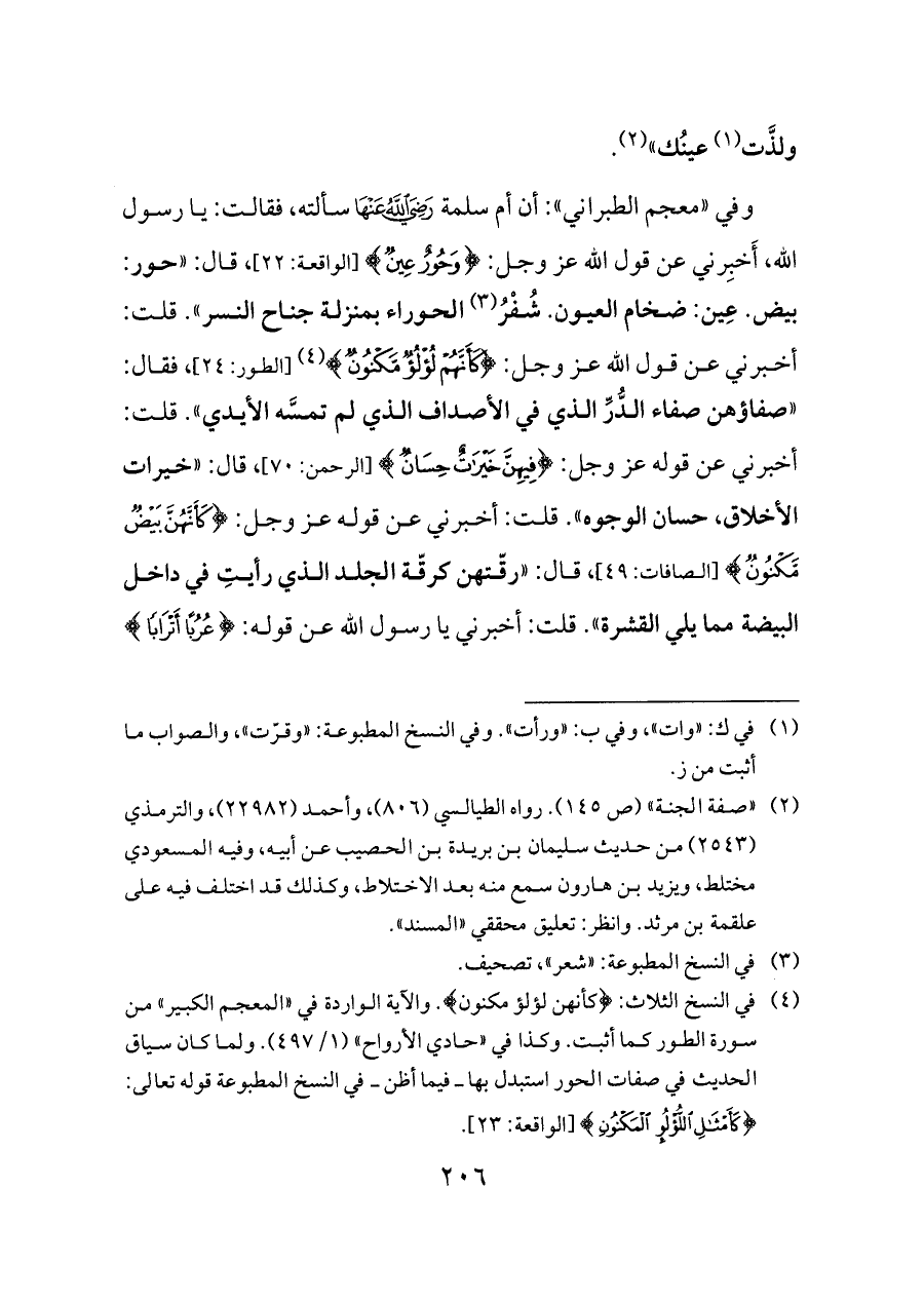 وفي «معجم الطبراني»: أن أم سلمة - رضي الله عنه - سألته، فقالت: يا رسول الله، أَخبِرني عن قول الله عز وجل: {وَحُورٌ عِينٌ} [الواقعة: ٢٢]، قال: «حور: بيض. عِين: ضخام العيون. شُفْرُ (¬٣) الحوراء بمنزلة جناح النسر». قلت: أخبرني عن قول الله عز وجل: {كَأَنَّهُمْ لُؤْلُؤٌ مَكْنُونٌ} (¬٤) [الطور: ٢٤]، فقال: «صفاؤهن صفاء الدُّرِّ الذي في الأصداف الذي لم تمسَّه الأيدي». قلت: أخبرني عن قوله عز وجل: {فِيهِنَّ خَيْرَاتٌ حِسَانٌ} [الرحمن: ٧٠]، قال: «خيرات الأخلاق، حسان الوجوه». قلت: أخبرني عن قوله عز وجل: {كَأَنَّهُنَّ بَيْضٌ مَكْنُونٌ} [الصافات: ٤٩]، قال: «رقّتهن كرقّة الجلد الذي رأيتِ في داخل البيضة مما يلي القشرة». قلت: أخبرني يا رسول الله عن قوله: {عُرُبًا أَتْرَابًا}