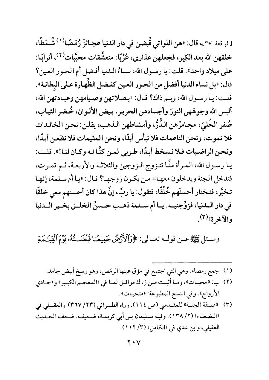 [الواقعة: ٣٧]، قال: «هن اللواتي قُبضن في دار الدنيا عجائزَ رُمْصًا (¬١) شُمْطًا، خلقهن الله بعد الكِبر، فجعلهن عذارى، عُرُبًا: متعشِّقات محبَّبات (¬٢)، أترابًا: على ميلاد واحد». قلت: يا رسول الله، نساءُ الدنيا أفضل أم الحور العين؟ قال: «بل نساء الدنيا أفضل من الحور العين كفضل الظِّهارة على البِطانة».