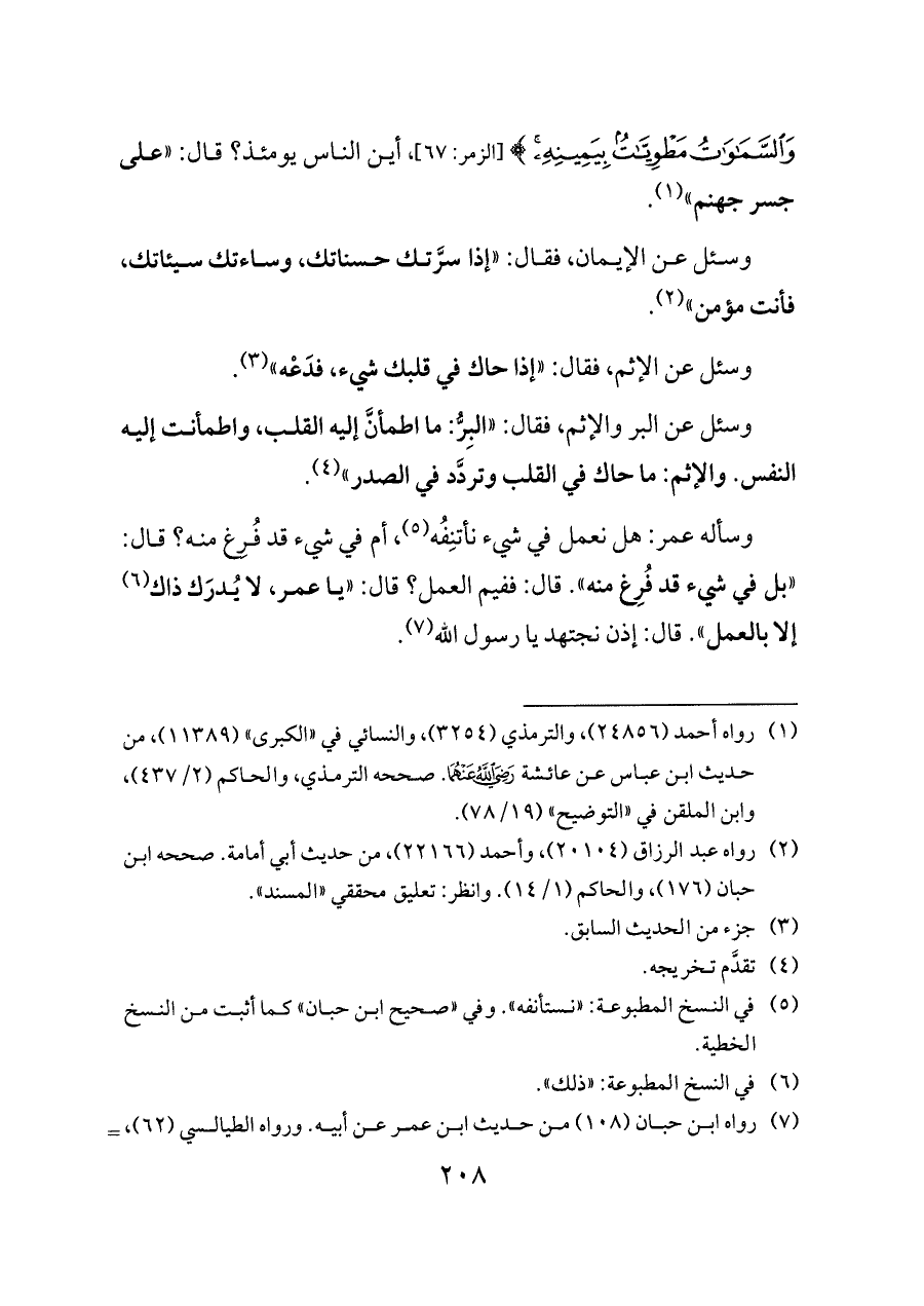 وسئل عن البر والإثم، فقال: «البِرُّ: ما اطمأنَّ إليه القلب، واطمأنت إليه النفس. والإثم: ما حاك في القلب وتردَّد في الصدر» (¬٤).