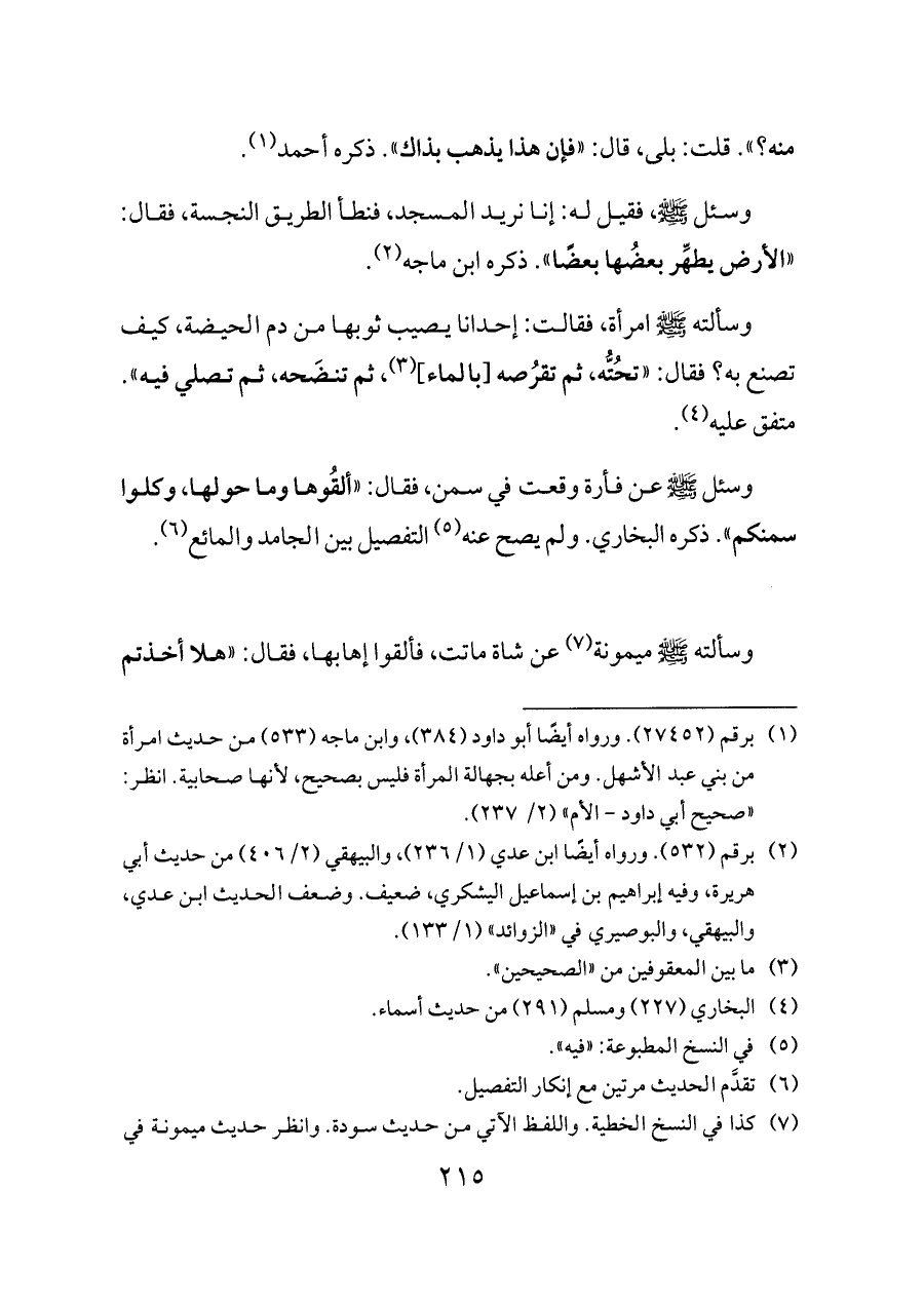 وسئل - صلى الله عليه وسلم - عن فأرة وقعت في سمن، فقال: «ألقُوها وما حولها، وكلوا سمنكم». ذكره البخاري. ولم يصح عنه (¬٥) التفصيل بين الجامد والمائع (¬٦).