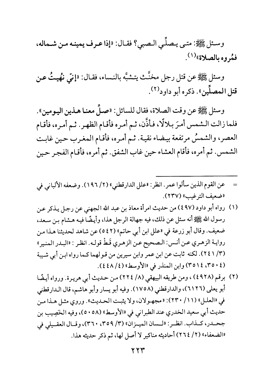 وسئل - صلى الله عليه وسلم -: متى يصلِّي الصبي؟ فقال: «إذا عرف يمينه من شماله، فمُروه بالصلاة» (¬١).