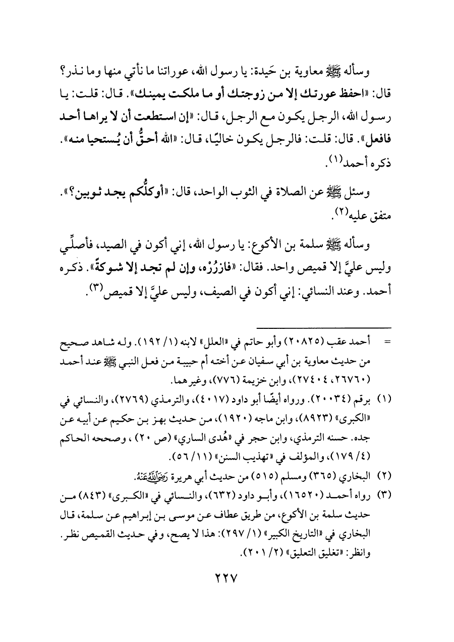 وسأله - صلى الله عليه وسلم - سلمة بن الأكوع: يا رسول الله، إني أكون في الصيد، فأصلِّي وليس عليَّ إلا قميص واحد. فقال: «فازرُرْه، وإن لم تجد إلا شوكةً». ذكره أحمد. وعند النسائي: إني أكون في الصيف، وليس عليَّ إلا قميص (¬٣).