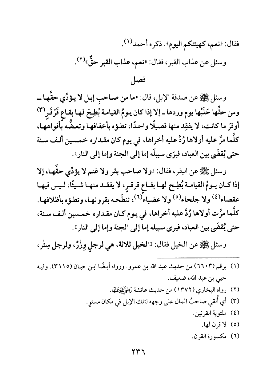 وسئل - صلى الله عليه وسلم - عن صدقة الإبل، قال: «ما من صاحبِ إبل لا يؤدِّي حقَّها ــ ومن حقِّها حَلَبُها يوم وردها ــ إلا إذا كان يومُ القيامة بُطِحَ لها بقاعٍ قَرْقَرٍ (¬٣) أوفرَ ما كانت، لا يفقِد منها فصيلًا واحدًا، تطؤه بأخفافها وتعضُّه بأفواهها، كلَّما مرَّ عليه أولاها رُدَّ عليه أخراها، في يوم كان مقداره خمسين ألف سنة حتى يُقضَى بين العباد، فيرَى سبيلَه إما إلى الجنة وإما إلى النار».