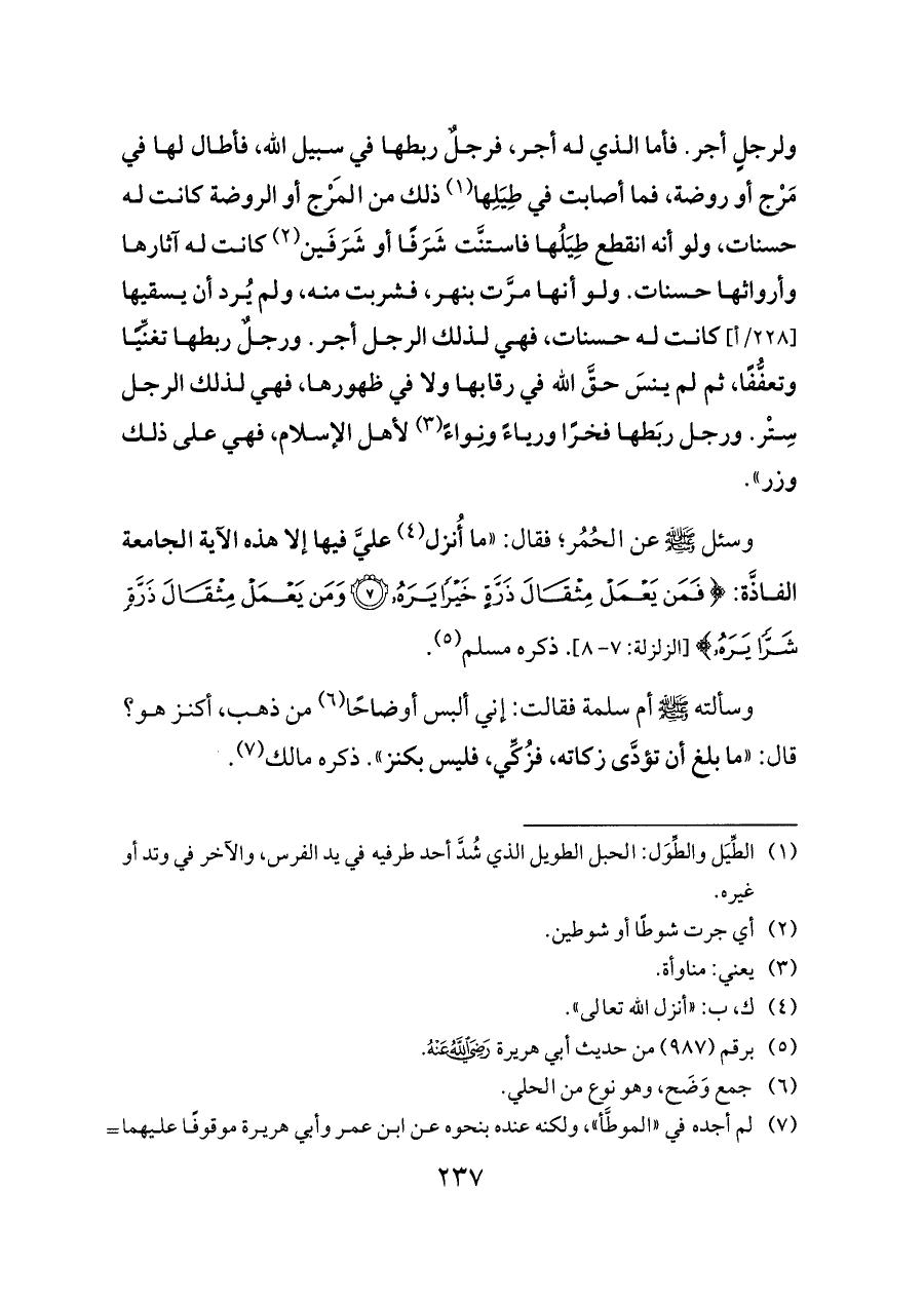 ولرجلٍ أجر. فأما الذي له أجر، فرجلٌ ربطها في سبيل الله، فأطال لها في مَرْج أو روضة، فما أصابت في طِيَلِها (¬١) ذلك من المَرْج أو الروضة كانت له حسنات، ولو أنه انقطع طِيَلُها فاستنَّت شَرَفًا أو شَرَفَين (¬٢) كانت له آثارها وأرواثها حسنات. ولو أنها مرَّت بنهر، فشربت منه، ولم يُرد أن يسقيها [٢٢٨/أ] كانت له حسنات، فهي لذلك الرجل أجر. ورجلٌ ربطها تغنِّيًا وتعفُّفًا، ثم لم ينسَ حقَّ الله في رقابها ولا في ظهورها، فهي لذلك الرجل سِتْر. ورجل ربَطها فخرًا ورياءً ونِواءً (¬٣) لأهل الإسلام، فهي على ذلك وزر».
