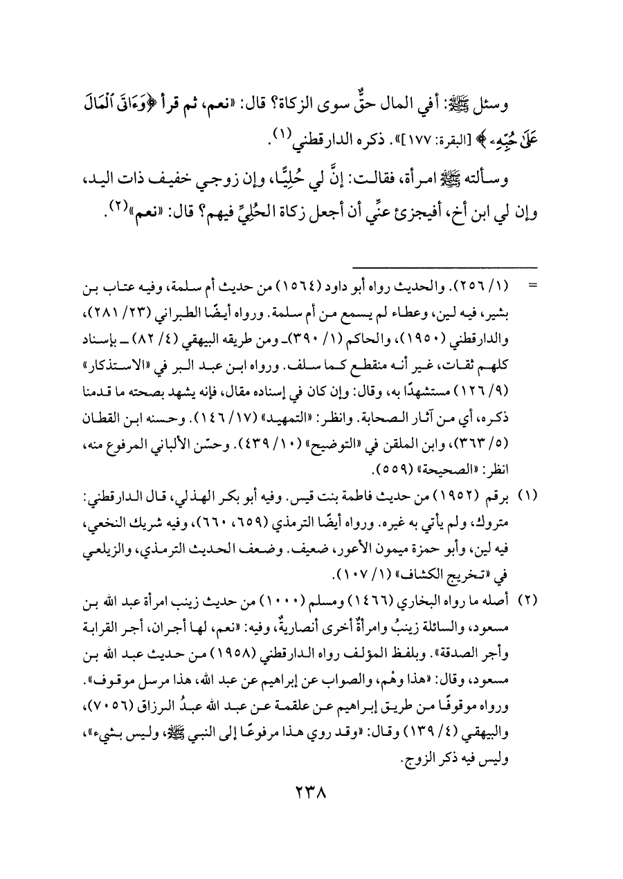 (¬٢) أصله ما رواه البخاري (١٤٦٦) ومسلم (١٠٠٠) من حديث زينب امرأة عبد الله بن مسعود، والسائلة زينبُ وامرأةٌ أخرى أنصاريةٌ، وفيه: «نعم، لها أجران، أجر القرابة وأجر الصدقة». وبلفظ المؤلف رواه الدارقطني (١٩٥٨) من حديث عبد الله بن مسعود، وقال: «هذا وهْم، والصواب عن إبراهيم عن عبد الله، هذا مرسل موقوف». ورواه موقوفًا من طريق إبراهيم عن علقمة عن عبد الله عبدُ الرزاق (٧٠٥٦)، والبيهقي (٤/ ١٣٩) وقال: «وقد روي هذا مرفوعًا إلى النبي - صلى الله عليه وسلم -، وليس بشيء»، وليس فيه ذكر الزوج.