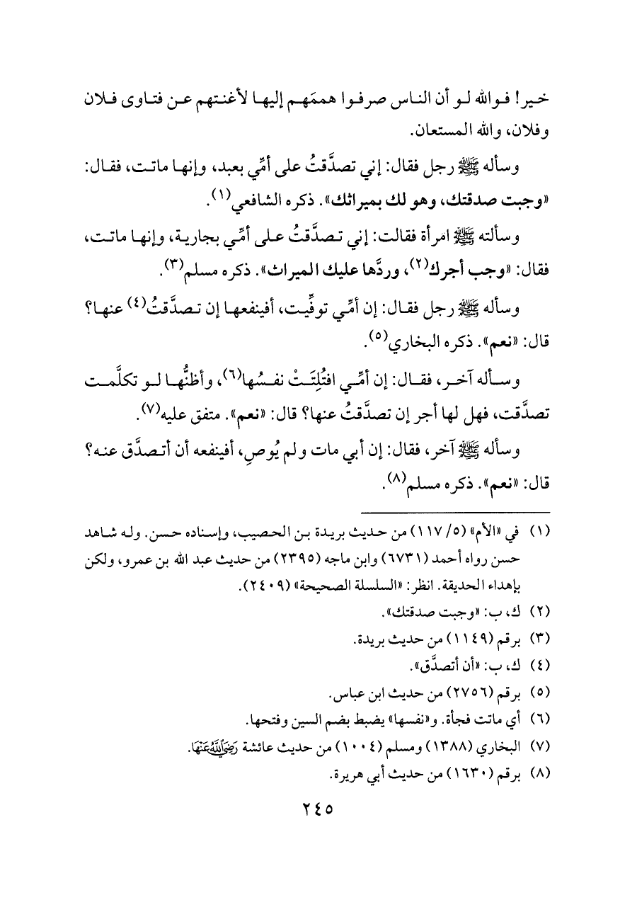 وسأله - صلى الله عليه وسلم - آخر، فقال: إن أبي مات ولم يُوصِ، أفينفعه أن أتصدَّق عنه؟ قال: «نعم». ذكره مسلم (¬٨).