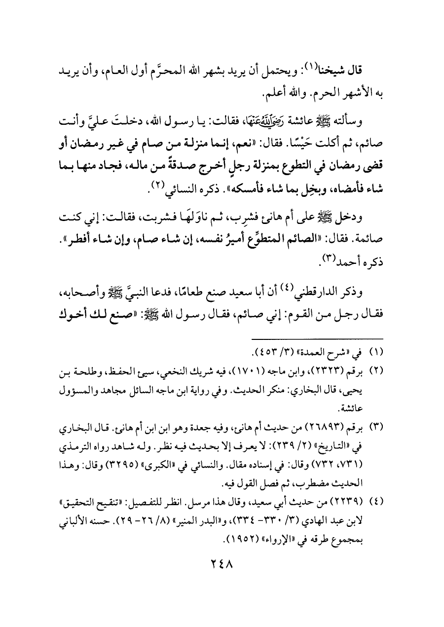 وسألته - صلى الله عليه وسلم - عائشة - رضي الله عنها -، فقالت: يا رسول الله، دخلتَ عليَّ وأنت صائم، ثم أكلت حَيْسًا. فقال: «نعم، إنما منزلة من صام في غير رمضان أو قضى رمضان في التطوع بمنزلة رجلٍ أخرج صدقةً من ماله، فجاد منها بما شاء فأمضاه، وبخِل بما شاء فأمسكه». ذكره النسائي (¬٢).