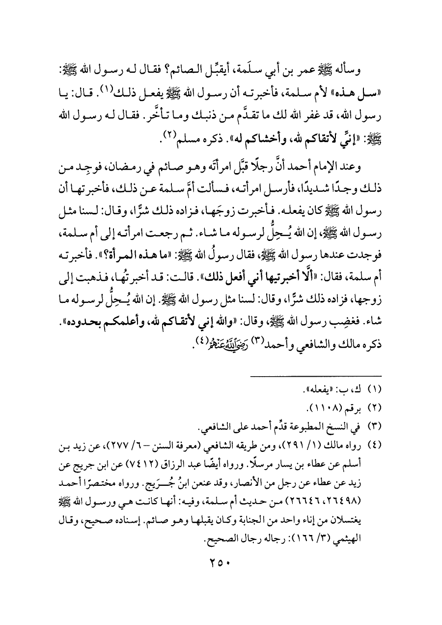 وعند الإمام أحمد أنَّ رجلًا قبَّل امرأتَه وهو صائم في رمضان، فوجِد من ذلك وجدًا شديدًا، فأرسل امرأته، فسألت أمَّ سلمة عن ذلك، فأخبرتها أن رسول الله - صلى الله عليه وسلم - كان يفعله. فأخبرت زوجَها، فزاده ذلك شرًّا، وقال: لسنا مثل رسول الله - صلى الله عليه وسلم -، إن الله يُحِلُّ لرسوله ما شاء. ثم رجعت امرأته إلى أم سلمة، فوجدت عندها رسول الله - صلى الله عليه وسلم -، فقال رسولُ الله - صلى الله عليه وسلم -: «ما هذه المرأة؟». فأخبرته أم سلمة، فقال: «ألَّا أخبرتيها أني أفعل ذلك». قالت: قد أخبرتُها، فذهبت إلى زوجها، فزاده ذلك شرًّا، وقال: لسنا مثل رسول الله - صلى الله عليه وسلم -. إن الله يُحِلُّ لرسوله ما شاء. فغضِب رسول الله - صلى الله عليه وسلم -، وقال: «والله إني لأتقاكم لله، وأعلمكم بحدوده». ذكره مالك والشافعي وأحمد (¬٣) - رضي الله عنهم - (¬٤).