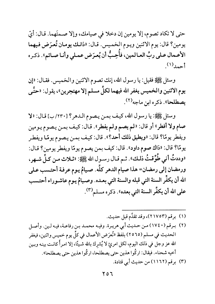 حتى لا تكاد تصوم، إلا يومين إن دخلا في صيامك، وإلا صمتَهما. قال: أيّ يومين؟ قال: يوم الاثنين ويوم الخميس. قال: «ذانك يومان تُعرَض فيهما الأعمال على ربِّ العالمين، فأُحِبُّ أن يُعرَض عملي وأنا صائم». ذكره أحمد (¬١).
