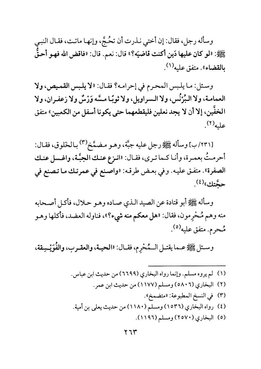 [٢٣١/ب] وسأله - صلى الله عليه وسلم - رجل عليه جبَّة، وهو مضمَّخ (¬٣) بالخَلوق، فقال: أحرمتُ بعمرة، وأنا كما ترى، فقال: «انزع عنك الجبَّة، واغسل عنك الصفرة». متفق عليه. وفي بعض طرقه: «واصنع في عمرتك ما تصنع في حجَّتك» (¬٤).