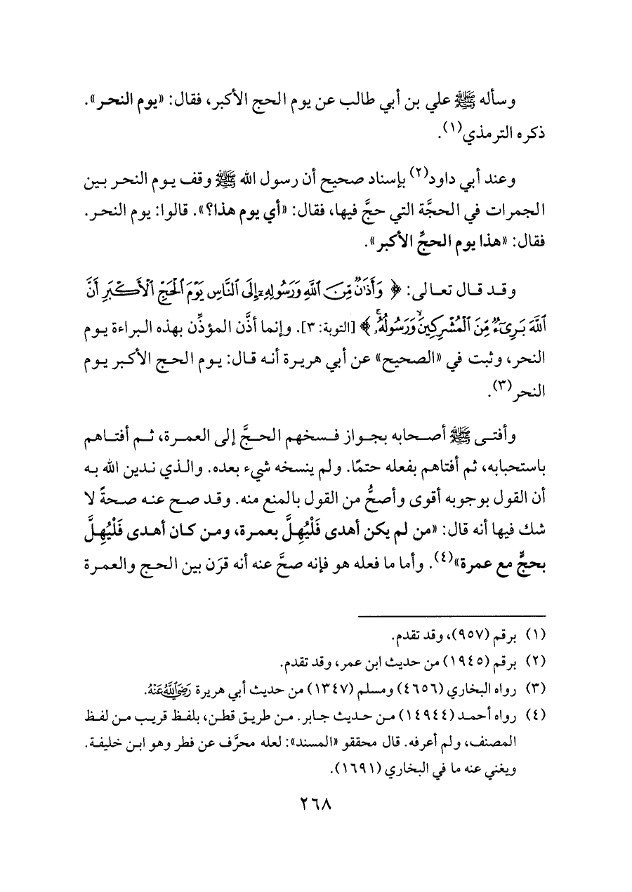 وعند أبي داود (¬٢) بإسناد صحيح أن رسول الله - صلى الله عليه وسلم - وقف يوم النحر بين الجمرات في الحجَّة التي حجَّ فيها، فقال: «أي يوم هذا؟». قالوا: يوم النحر. فقال: «هذا يوم الحجِّ الأكبر».