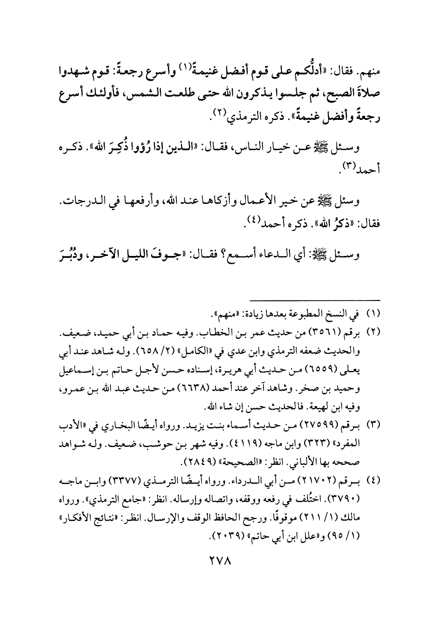 وسئل - صلى الله عليه وسلم - عن خير الأعمال وأزكاها عند الله، وأرفعها في الدرجات. فقال: «ذكرُ الله». ذكره أحمد (¬٤).