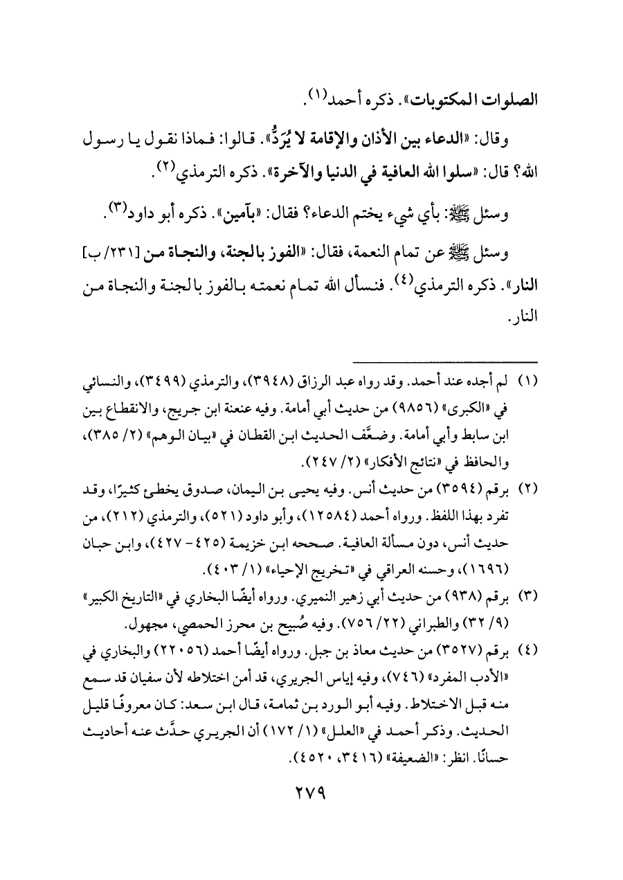 وسئل - صلى الله عليه وسلم - عن تمام النعمة، فقال: «الفوز بالجنة، والنجاة من [٢٣١/ب] النار». ذكره الترمذي (¬٤). فنسأل الله تمام نعمته بالفوز بالجنة والنجاة من النار.