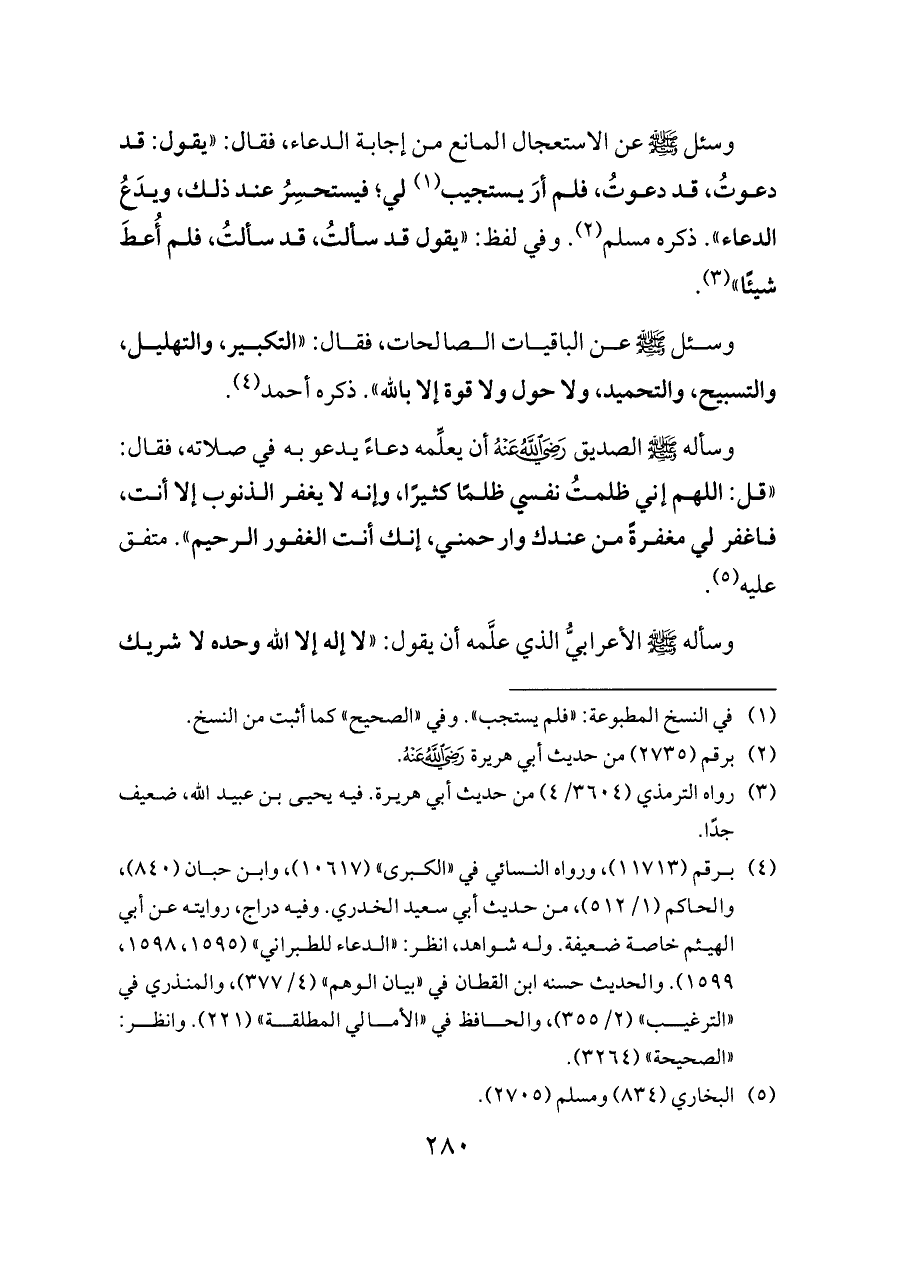 وسئل - صلى الله عليه وسلم - عن الباقيات الصالحات، فقال: «التكبير، والتهليل، والتسبيح، والتحميد، ولا حول ولا قوة إلا بالله». ذكره أحمد (¬٤).