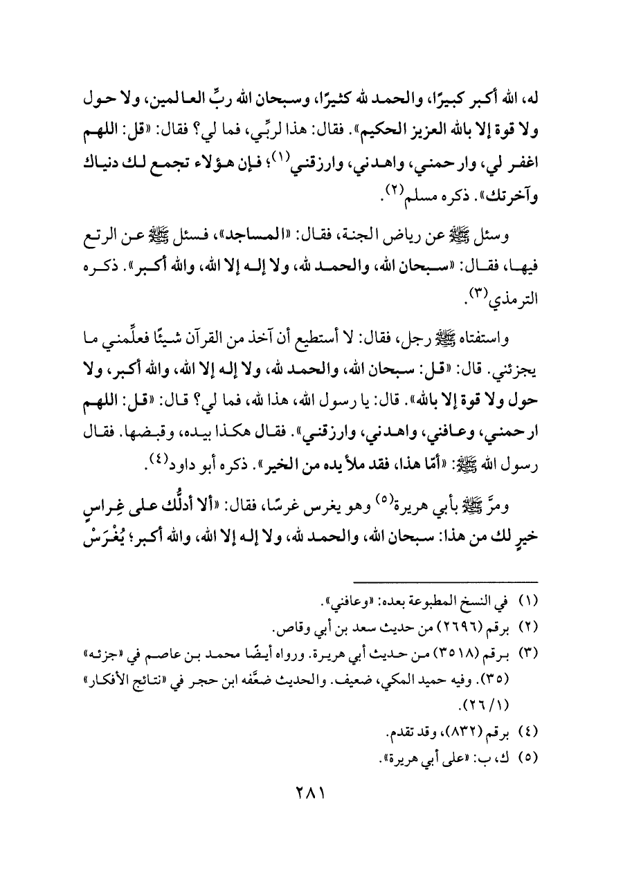 ومرَّ - صلى الله عليه وسلم - بأبي هريرة (¬٥) وهو يغرس غرسًا، فقال: «ألا أدلُّك على غِراسٍ خيرٍ لك من هذا: سبحان الله، والحمد لله، ولا إله إلا الله، والله أكبر؛ يُغْرَسْ