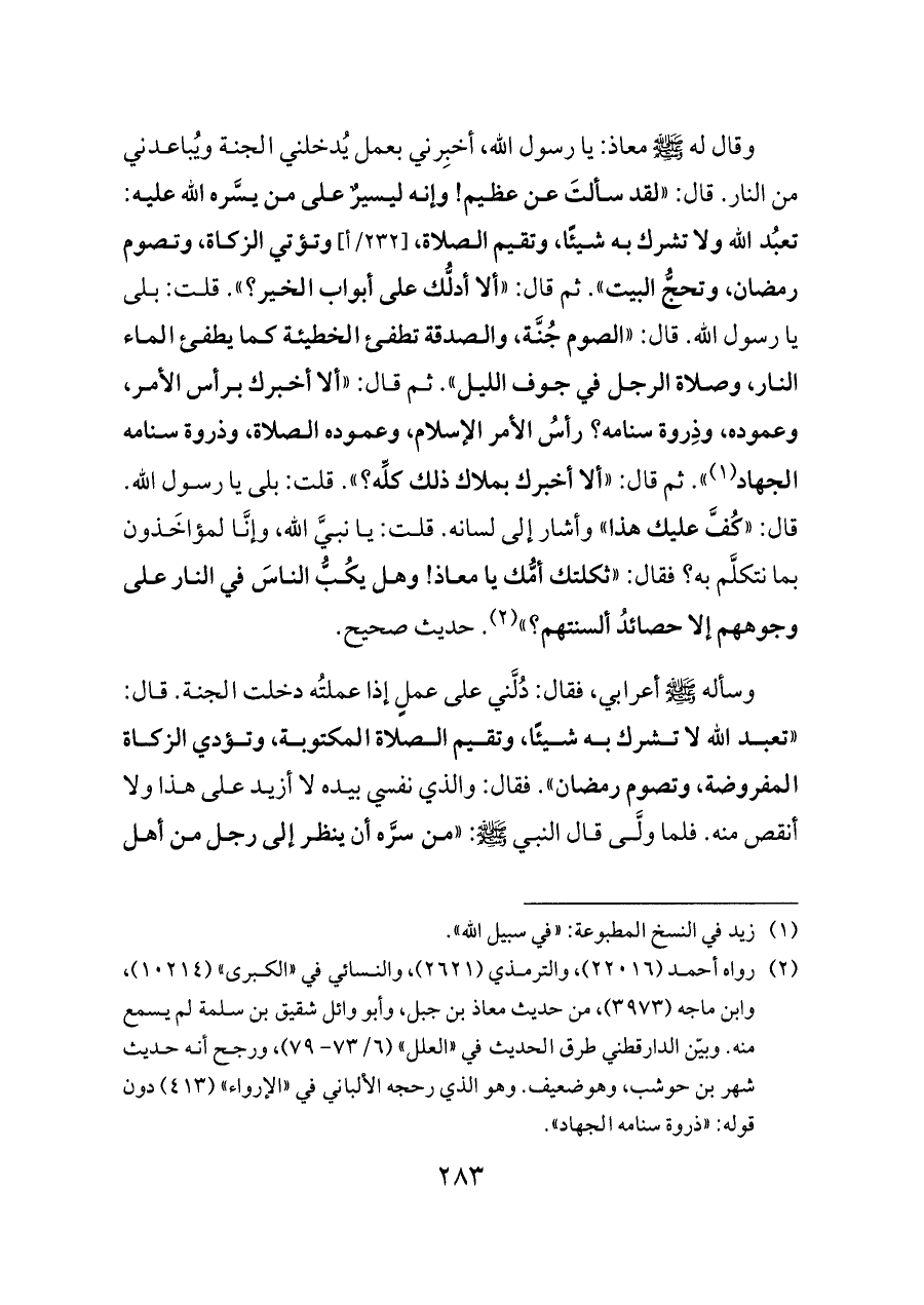 (¬٢) رواه أحمد (٢٢٠١٦)، والترمذي (٢٦٢١)، والنسائي في «الكبرى» (١٠٢١٤)، وابن ماجه (٣٩٧٣)، من حديث معاذ بن جبل، وأبو وائل شقيق بن سلمة لم يسمع منه. وبيّن الدارقطني طرق الحديث في «العلل» (٦/ ٧٣ - ٧٩)، ورجح أنه حديث شهر بن حوشب، وهوضعيف. وهو الذي رحجه الألباني في «الإرواء» (٤١٣) دون قوله: «ذروة سنامه الجهاد».