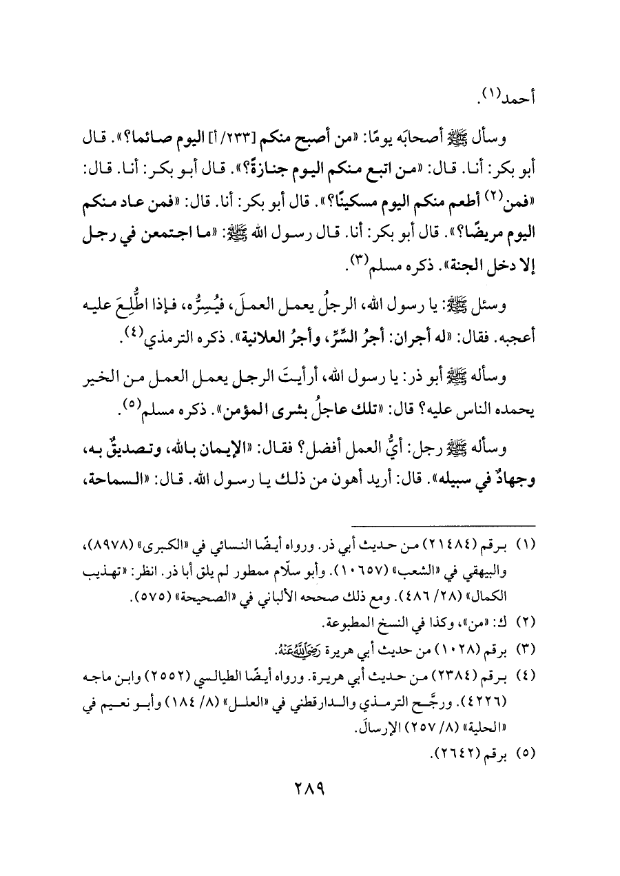 وسأل - صلى الله عليه وسلم - أصحابَه يومًا: «من أصبح منكم [٢٣٣/أ] اليوم صائما؟». قال أبو بكر: أنا. قال: «من اتبع منكم اليوم جنازةً؟». قال أبو بكر: أنا. قال: «فمن (¬٢) أطعم منكم اليوم مسكينًا؟». قال أبو بكر: أنا. قال: «فمن عاد منكم اليوم مريضًا؟». قال أبو بكر: أنا. قال رسول الله - صلى الله عليه وسلم -: «ما اجتمعن في رجل إلا دخل الجنة». ذكره مسلم (¬٣).