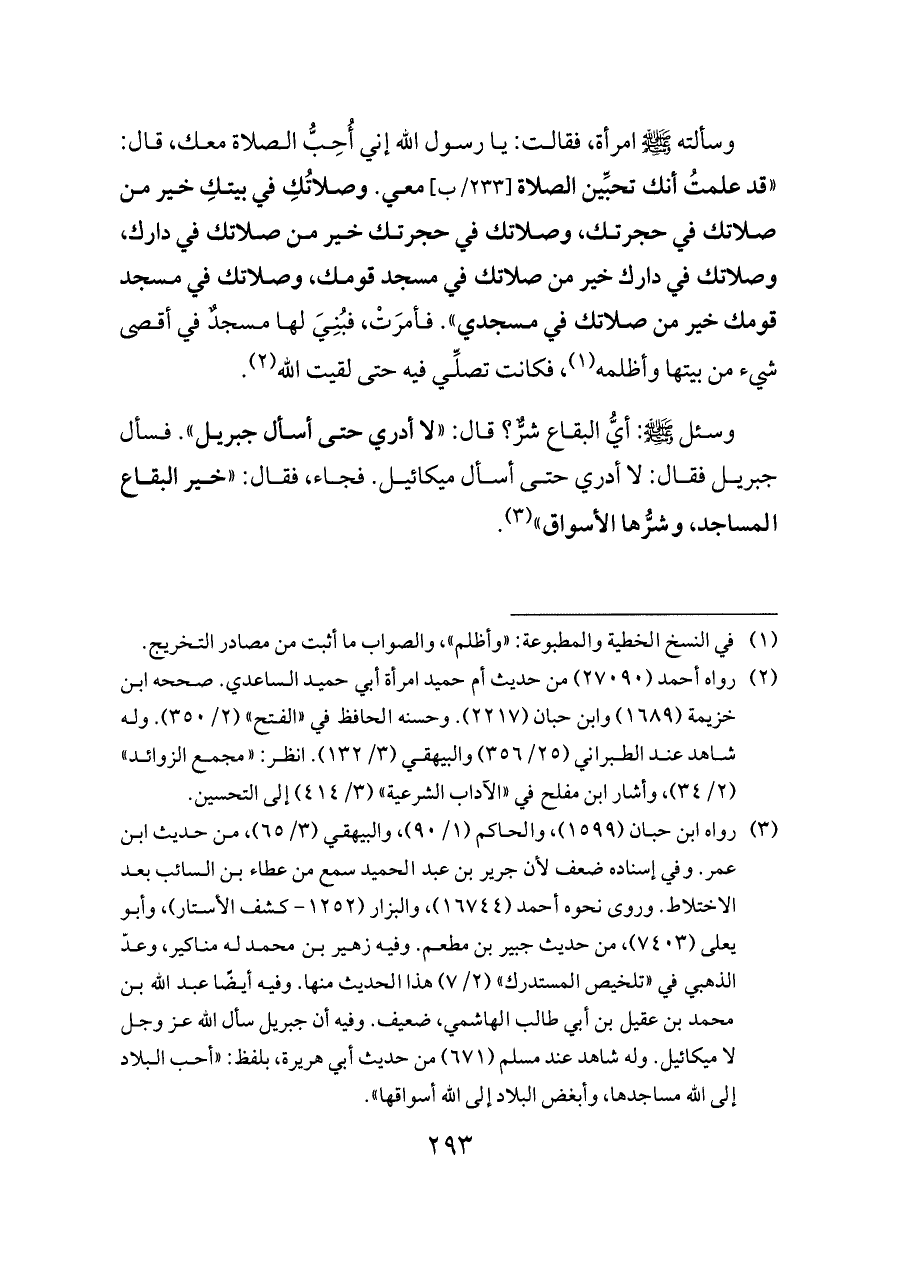 (¬٣) رواه ابن حبان (١٥٩٩)، والحاكم (١/ ٩٠)، والبيهقي (٣/ ٦٥)، من حديث ابن عمر. وفي إسناده ضعف لأن جرير بن عبد الحميد سمع من عطاء بن السائب بعد الاختلاط. وروى نحوه أحمد (١٦٧٤٤)، والبزار (١٢٥٢ - كشف الأستار)، وأبو يعلى (٧٤٠٣)، من حديث جبير بن مطعم. وفيه زهير بن محمد له مناكير، وعدّ الذهبي في «تلخيص المستدرك» (٢/ ٧) هذا الحديث منها. وفيه أيضًا عبد الله بن محمد بن عقيل بن أبي طالب الهاشمي، ضعيف. وفيه أن جبريل سأل الله عز وجل لا ميكائيل. وله شاهد عند مسلم (٦٧١) من حديث أبي هريرة، بلفظ: «أحب البلاد إلى الله مساجدها، وأبغض البلاد إلى الله أسواقها».