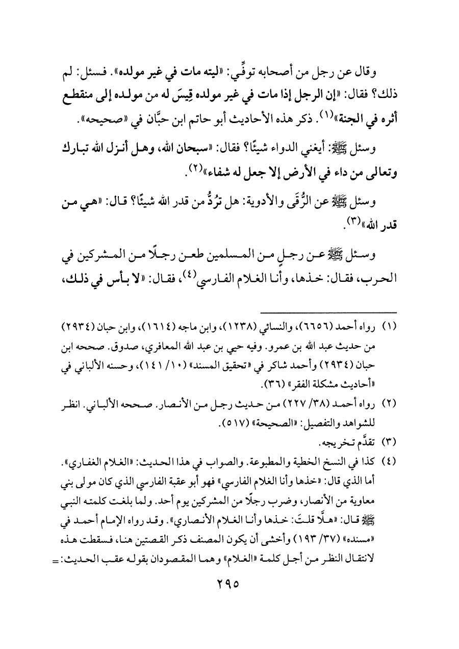 (¬٤) كذا في النسخ الخطية والمطبوعة. والصواب في هذا الحديث: «الغلام الغفاري». أما الذي قال: «خذها وأنا الغلام الفارسي» فهو أبو عقبة الفارسي الذي كان مولى بني معاوية من الأنصار، وضرب رجلًا من المشركين يوم أحد. ولما بلغت كلمته النبي - صلى الله عليه وسلم - قال: «هلَّا قلتَ: خذها وأنا الغلام الأنصاري». وقد رواه الإمام أحمد في «مسنده» (٣٧/ ١٩٣) وأخشى أن يكون المصنف ذكر القصتين هنا، فسقطت هذه لانتقال النظر من أجل كلمة «الغلام» وهما المقصودان بقوله عقب الحديث: «ذكرهما أحمد». أما أن يقصد الحديث الأخير والحديث السابق عن الرقى فهو بعيد، فإن حديث الشفاء الذي قبلهما في «المسند» أيضًا، فكان ينبغي أن يقول: «ذكرها أحمد». والله أعلم.