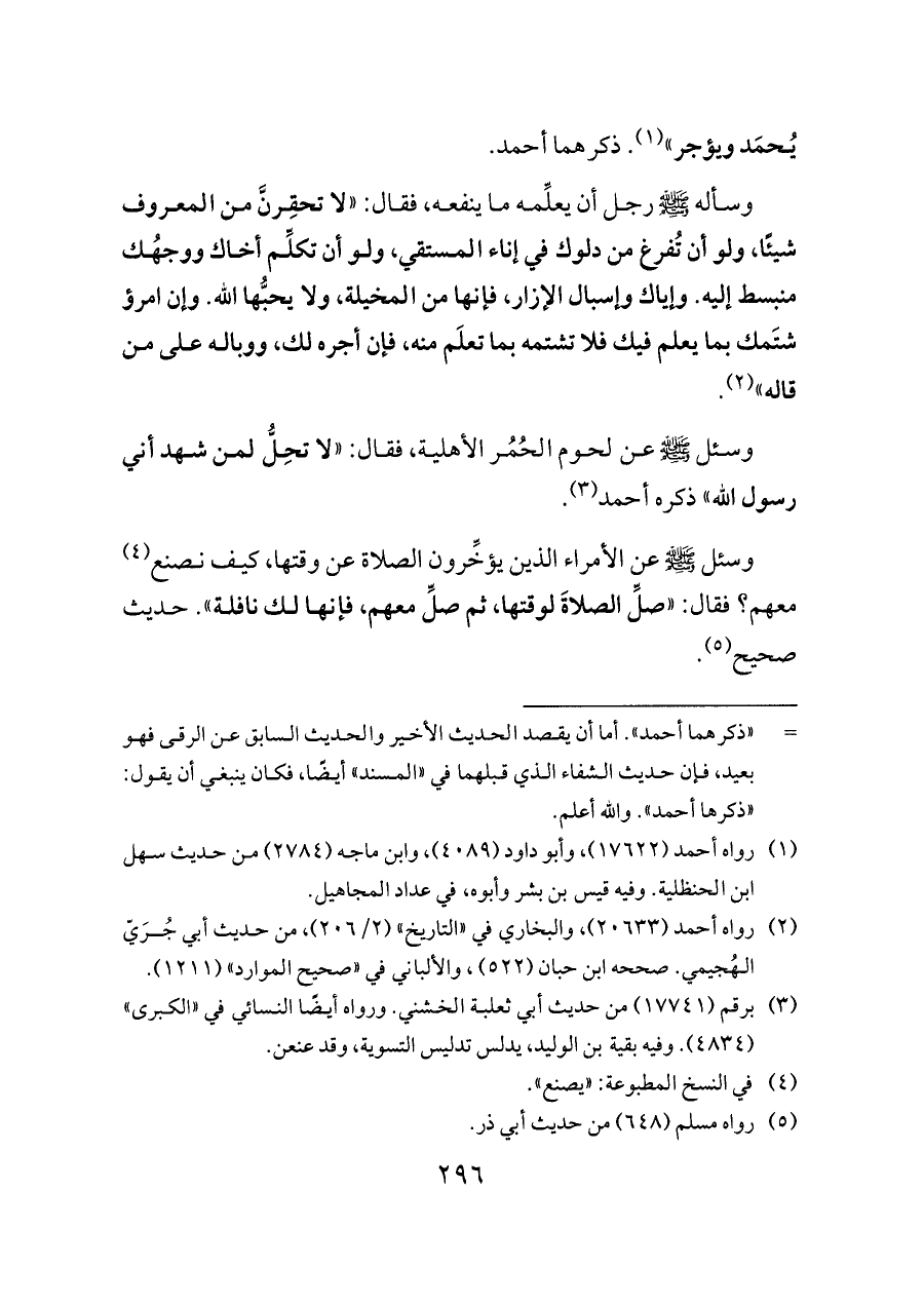 وسأله - صلى الله عليه وسلم - رجل أن يعلِّمه ما ينفعه، فقال: «لا تحقِرنَّ من المعروف شيئًا، ولو أن تُفرغ من دلوك في إناء المستقي، ولو أن تكلِّم أخاك ووجهُك منبسط إليه. وإياك وإسبال الإزار، فإنها من المخيلة، ولا يحبُّها الله. وإن امرؤ شتَمك بما يعلم فيك فلا تشتمه بما تعلَم منه، فإن أجره لك، ووباله على من قاله» (¬٢).