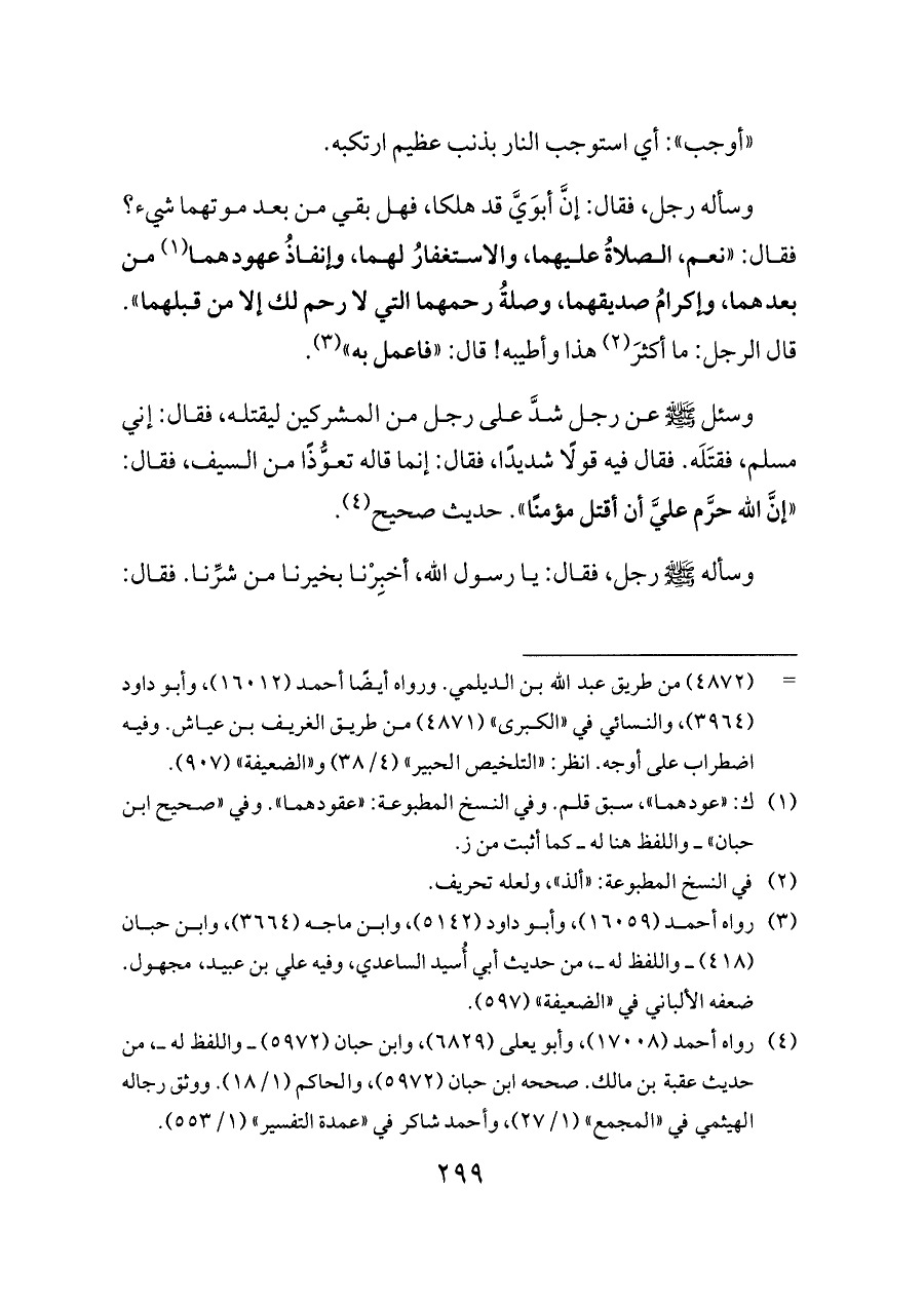 وسأله رجل، فقال: إنَّ أبوَيَّ قد هلكا، فهل بقي من بعد موتهما شيء؟ فقال: «نعم، الصلاةُ عليهما، والاستغفارُ لهما، وإنفاذُ عهودهما (¬١) من بعدهما، وإكرامُ صديقهما، وصلةُ رحمهما التي لا رحم لك إلا من قبلهما». قال الرجل: ما أكثرَ (¬٢) هذا وأطيبه! قال: «فاعمل به» (¬٣).