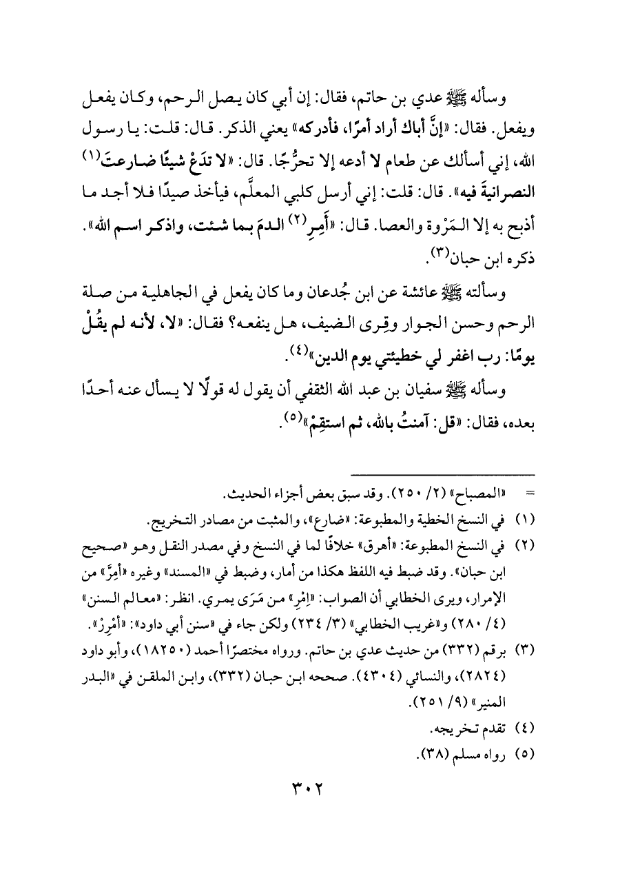 وسأله - صلى الله عليه وسلم - عدي بن حاتم، فقال: إن أبي كان يصل الرحم، وكان يفعل ويفعل. فقال: «إنَّ أباك أراد أمرًا، فأدركه» يعني الذكر. قال: قلت: يا رسول الله، إني أسألك عن طعام لا أدعه إلا تحرُّجًا. قال: «لا تدَعْ شيئًا ضارعتَ (¬١) النصرانيةَ فيه». قال: قلت: إني أرسل كلبي المعلَّم، فيأخذ صيدًا فلا أجد ما أذبح به إلا المَرْوة والعصا. قال: «أَمِرِ (¬٢) الدمَ بما شئت، واذكر اسم الله». ذكره ابن حبان (¬٣).