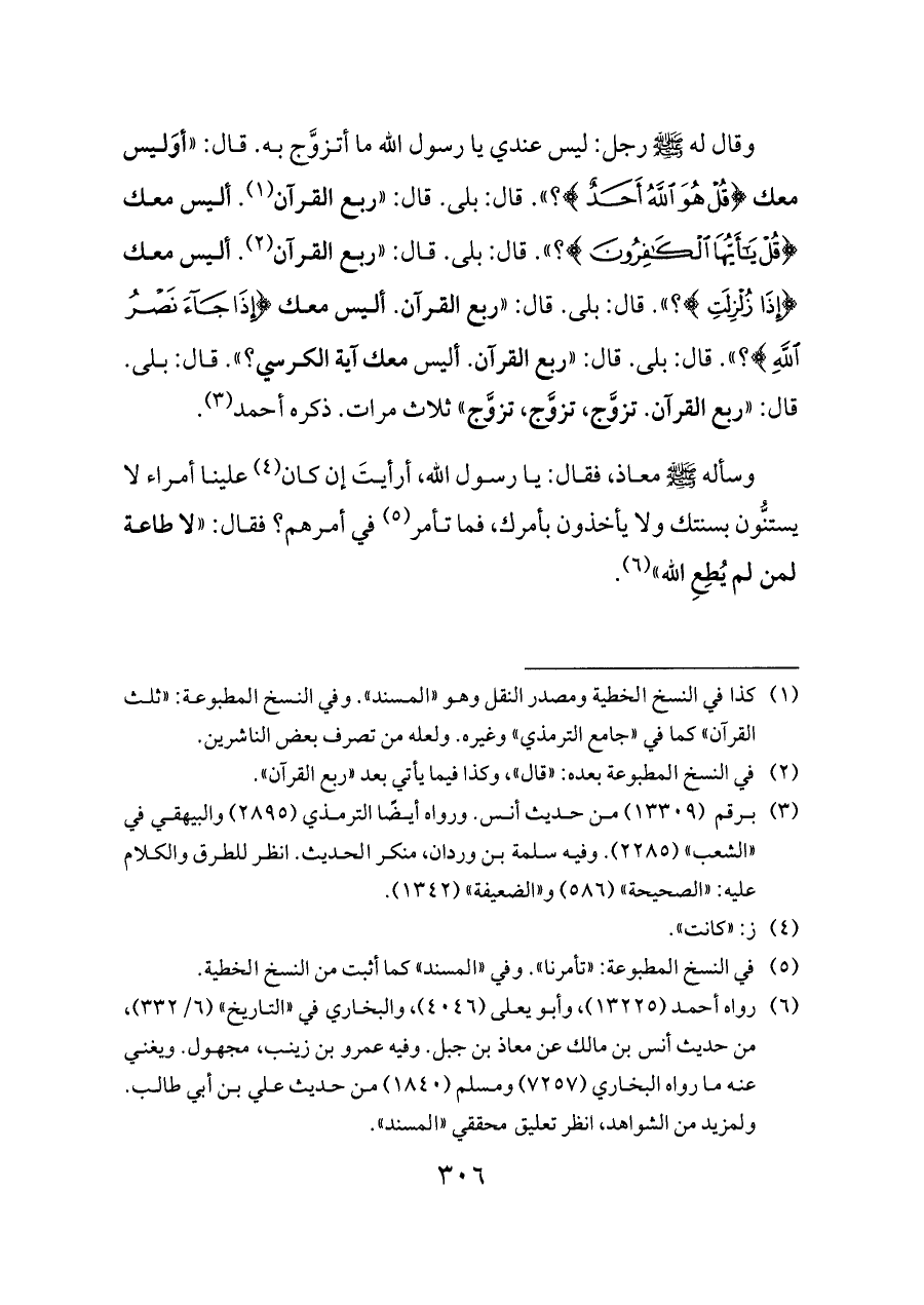 (¬٦) رواه أحمد (١٣٢٢٥)، وأبو يعلى (٤٠٤٦)، والبخاري في «التاريخ» (٦/ ٣٣٢)، من حديث أنس بن مالك عن معاذ بن جبل. وفيه عمرو بن زينب، مجهول. ويغني عنه ما رواه البخاري (٧٢٥٧) ومسلم (١٨٤٠) من حديث علي بن أبي طالب. ولمزيد من الشواهد، انظر تعليق محققي «المسند».