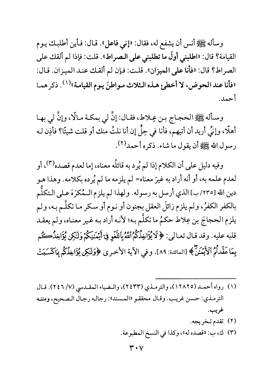 وفيه دليل على أن الكلام إذا لم يُرد به قائلُه معناه، إما لعدم قصده (¬٣)، أو لعدم علمه به، أو أنه أراد به غيرَ معناه= لم يلزمه ما لم يُرده بكلامه. وهذا هو دين الله [٢٣٥/ب] الذي أرسل به رسوله. ولهذا لم يلزم المُكرَهَ على التكلُّم بالكفر الكفرُ، ولم يلزم زائلَ العقل بجنون أو نوم أو سكر ما تكلَّم به، ولم يلزم الحجاجَ بن عِلاط حكمُ ما تكلَّم به؛ لأنه أراد به غير معناه، ولم يعقد قلبه عليه. وقد قال تعالى: {لَا يُؤَاخِذُكُمُ اللَّهُ بِاللَّغْوِ فِي أَيْمَانِكُمْ وَلَكِنْ يُؤَاخِذُكُمْ بِمَا عَقَّدْتُمُ الْأَيْمَانَ} [المائدة: ٨٩]. وفي الآية الأخرى {وَلَكِنْ يُؤَاخِذُكُمْ بِمَا كَسَبَتْ
