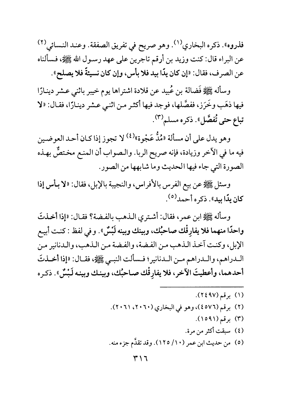 وسأله - صلى الله عليه وسلم - ابن عمر، فقال: أشتري الذهب بالفضة؟ فقال: «إذا أخذتَ واحدًا منهما فلا يفارِقْك صاحبُك، وبينك وبينه لَبْسٌ». وفي لفظ: كنت أبيع الإبل، وكنت آخذ الذهب من الفضة، والفضة من الذهب، والدنانير من الدراهم، والدراهم من الدنانير؛ فسألت النبي - صلى الله عليه وسلم -، فقال: «إذا أخذتَ أحدهما، وأعطيتَ الآخر، فلا يفارِقْك صاحبُك، وبينك وبينه لَبْسٌ». ذكره