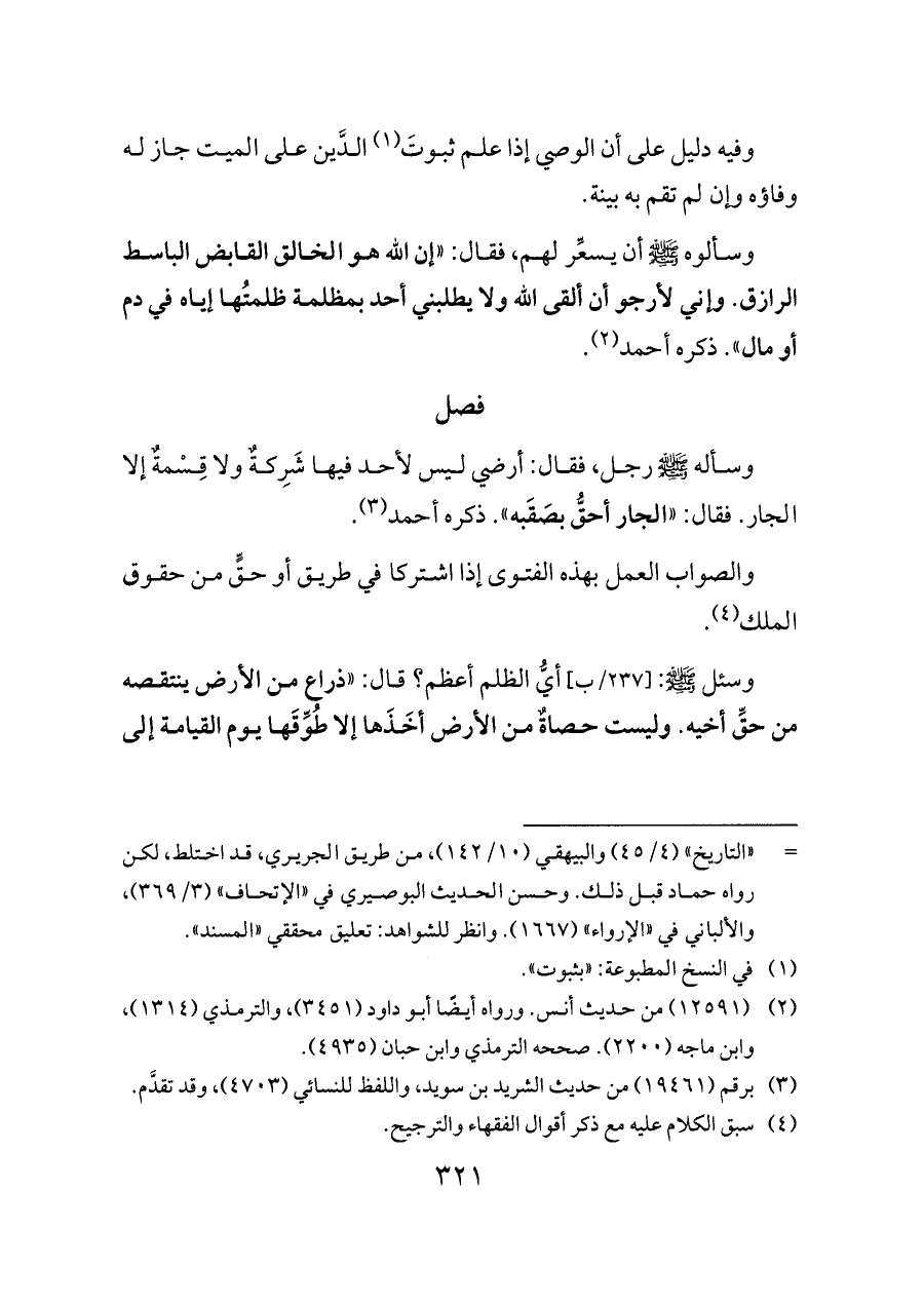 وسئل - صلى الله عليه وسلم -: [٢٣٧/ب] أيُّ الظلم أعظم؟ قال: «ذراع من الأرض ينتقصه من حقِّ أخيه. وليست حصاةٌ من الأرض أخَذَها إلا طُوِّقَها يوم القيامة إلى