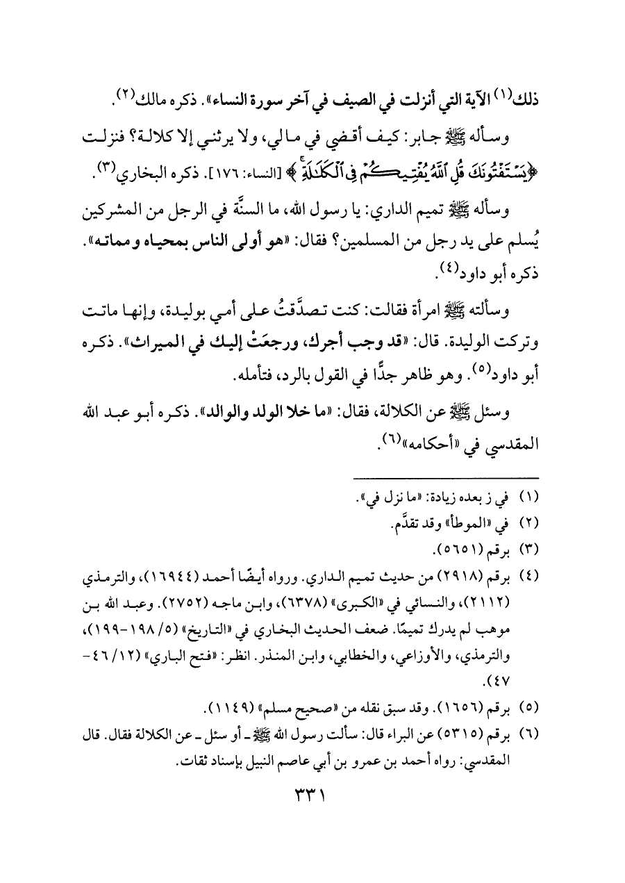 وسئل - صلى الله عليه وسلم - عن الكلالة، فقال: «ما خلا الولد والوالد». ذكره أبو عبد الله المقدسي في «أحكامه» (¬٦).