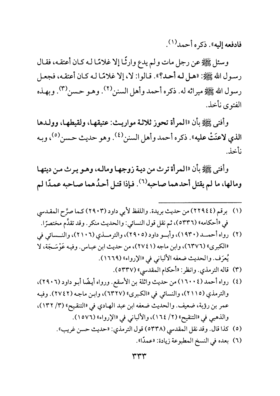 وأفتى - صلى الله عليه وسلم - بأن «المرأة تحوز ثلاثة مواريث: عتيقها، ولقيطها، وولدها الذي لاعنَتْ عليه». ذكره أحمد وأهل السنن (¬٤). وهو حديث حسن (¬٥)، وبه نأخذ.