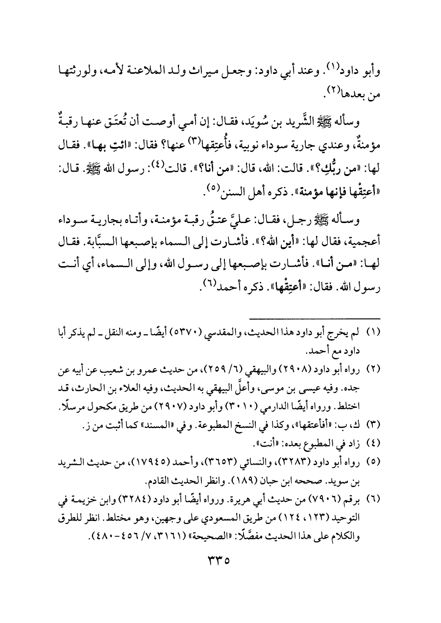 وسأله - صلى الله عليه وسلم - الشَّريد بن سُويَد، فقال: إن أمي أوصت أن تُعتَق عنها رقبةٌ مؤمنةٌ، وعندي جارية سوداء نوبية، فأُعتِقها (¬٣) عنها؟ فقال: «ائتِ بها». فقال لها: «من ربُّكِ؟». قالت: الله، قال: «من أنا؟». قالت (¬٤): رسول الله - صلى الله عليه وسلم -. قال: «أعتِقْها فإنها مؤمنة». ذكره أهل السنن (¬٥).