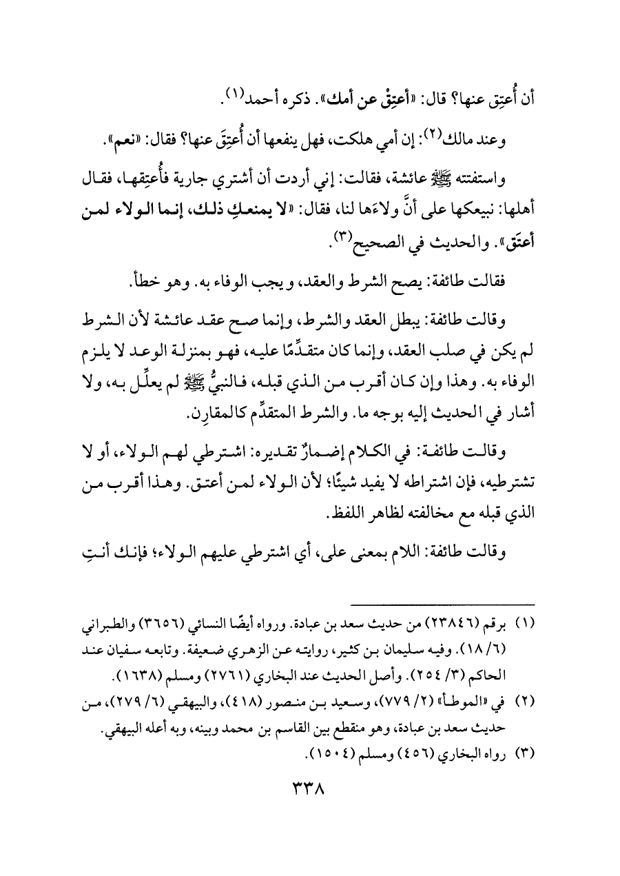 وقالت طائفة: يبطل العقد والشرط، وإنما صح عقد عائشة لأن الشرط لم يكن في صلب العقد، وإنما كان متقدِّمًا عليه، فهو بمنزلة الوعد لا يلزم الوفاء به. وهذا وإن كان أقرب من الذي قبله، فالنبيُّ - صلى الله عليه وسلم - لم يعلِّل به، ولا أشار في الحديث إليه بوجه ما. والشرط المتقدِّم كالمقارِن.