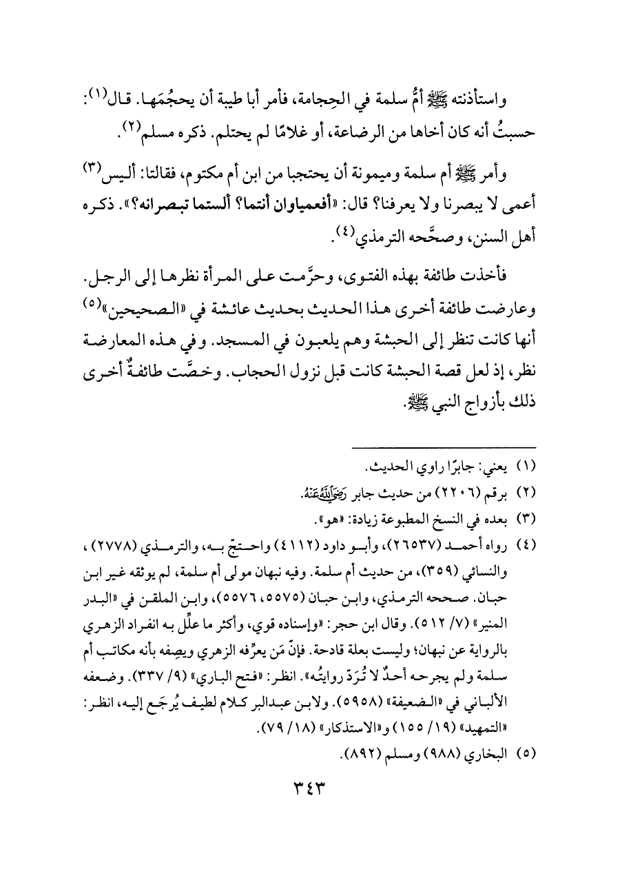 فأخذت طائفة بهذه الفتوى، وحرَّمت على المرأة نظرها إلى الرجل. وعارضت طائفة أخرى هذا الحديث بحديث عائشة في «الصحيحين» (¬٥) أنها كانت تنظر إلى الحبشة وهم يلعبون في المسجد. وفي هذه المعارضة نظر، إذ لعل قصة الحبشة كانت قبل نزول الحجاب. وخصَّت طائفةٌ أخرى ذلك بأزواج النبي - صلى الله عليه وسلم -.