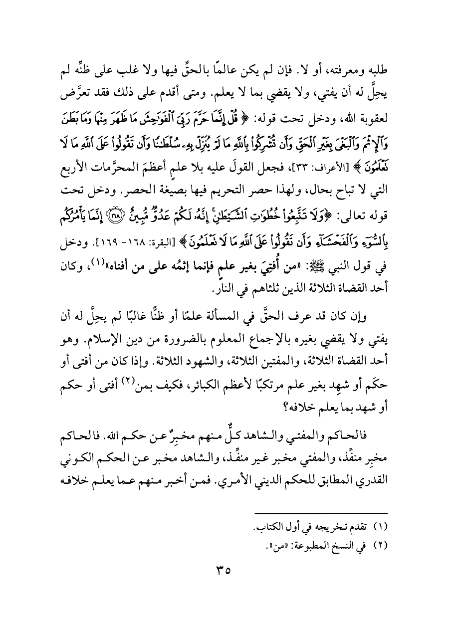 طلبه ومعرفته، أو لا. فإن لم يكن عالمًا بالحقِّ فيها ولا غلب على ظنِّه لم يحِلَّ له أن يفتي، ولا يقضي بما لا يعلم. ومتى أقدم على ذلك فقد تعرَّض لعقوبة الله، ودخل تحت قوله: {قُلْ إِنَّمَا حَرَّمَ رَبِّيَ الْفَوَاحِشَ مَا ظَهَرَ مِنْهَا وَمَا بَطَنَ وَالْإِثْمَ وَالْبَغْيَ بِغَيْرِ الْحَقِّ وَأَنْ تُشْرِكُوا بِاللَّهِ مَا لَمْ يُنَزِّلْ بِهِ سُلْطَانًا وَأَنْ تَقُولُوا عَلَى اللَّهِ مَا لَا تَعْلَمُونَ} [الأعراف: ٣٣]، فجعل القولَ عليه بلا علمٍ أعظمَ المحرَّمات الأربع التي لا تباح بحال، ولهذا حصر التحريم فيها بصيغة الحصر. ودخل تحت قوله تعالى: {وَلَا تَتَّبِعُوا خُطُوَاتِ الشَّيْطَانِ إِنَّهُ لَكُمْ عَدُوٌّ مُبِينٌ (١٦٨) إِنَّمَا يَأْمُرُكُمْ بِالسُّوءِ وَالْفَحْشَاءِ وَأَنْ تَقُولُوا عَلَى اللَّهِ مَا لَا تَعْلَمُونَ} [البقرة: ١٦٨ - ١٦٩]. ودخل في قول النبي - صلى الله عليه وسلم -: «من أُفتِيَ بغير علمٍ فإنما إثمُه على من أفتاه» (¬١)، وكان أحد القضاة الثلاثة الذين ثلثاهم في النار.