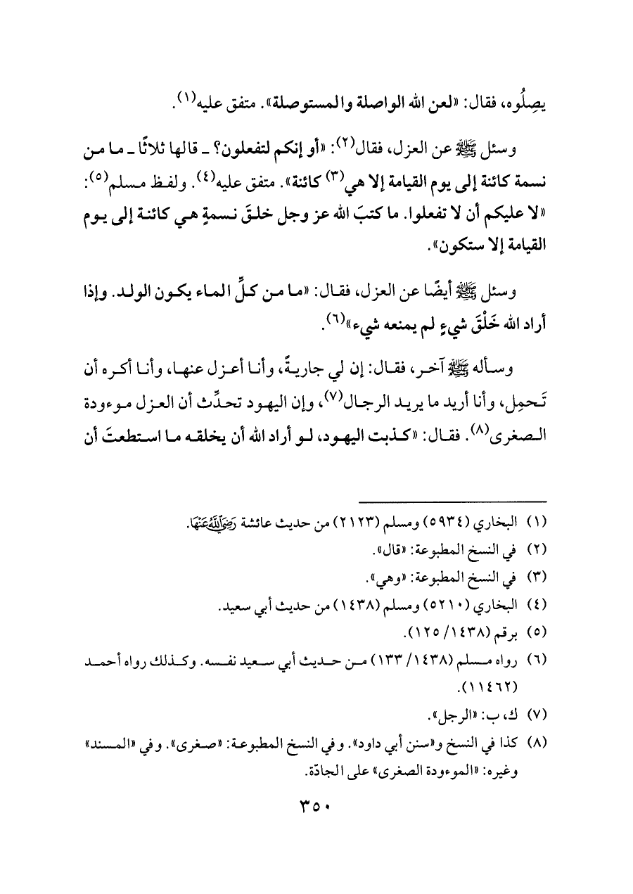 وسئل - صلى الله عليه وسلم - عن العزل، فقال (¬٢): «أو إنكم لتفعلون؟ ــ قالها ثلاثًا ــ ما من نسمة كائنة إلى يوم القيامة إلا هي (¬٣) كائنة». متفق عليه (¬٤). ولفظ مسلم (¬٥): «لا عليكم أن لا تفعلوا. ما كتبَ الله عز وجل خلقَ نسمةٍ هي كائنة إلى يوم القيامة إلا ستكون».