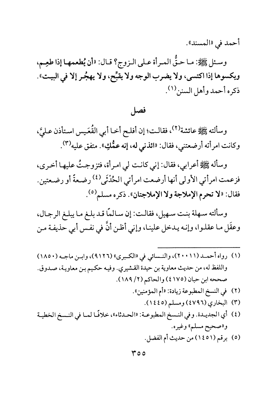 وسئل - صلى الله عليه وسلم -: ما حقُّ المرأة على الزوج؟ قال: «أن يُطعمها إذا طعِم، ويكسوها إذا اكتسى، ولا يضرب الوجه ولا يقبِّح، ولا يهجُر إلا في البيت». ذكره أحمد وأهل السنن (¬١).