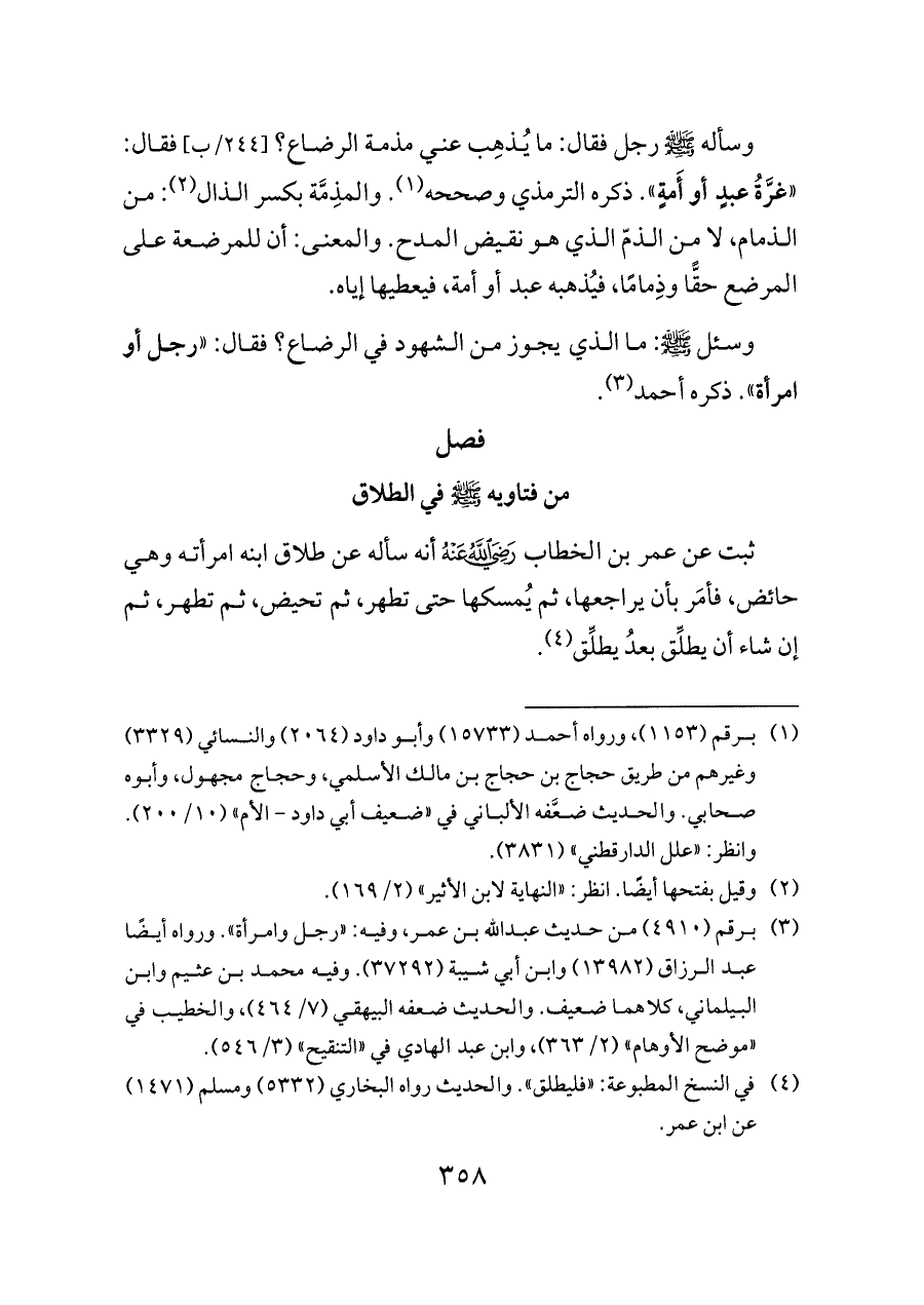وسأله - صلى الله عليه وسلم - رجل فقال: ما يُذهِب عني مذمة الرضاع؟ [٢٤٤/ب] فقال: «غرَّةُ عبدٍ أو أَمةٍ». ذكره الترمذي وصححه (¬١). والمذِمَّة بكسر الذال (¬٢): من الذمام، لا من الذمّ الذي هو نقيض المدح. والمعنى: أن للمرضعة على المرضع حقًّا وذِمامًا، فيُذهبه عبد أو أمة، فيعطيها إياه.