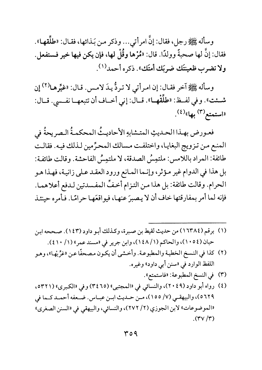 وسأله - صلى الله عليه وسلم - آخر فقال: إن امرأتي لا تردُّ يدَ لامس. قال: «غيِّرها (¬٢) إن شئت». وفي لفظ: «طلِّقْها». قال: إني أخاف أن تتبعها نفسي. قال: «استمتع (¬٣) بها» (¬٤).