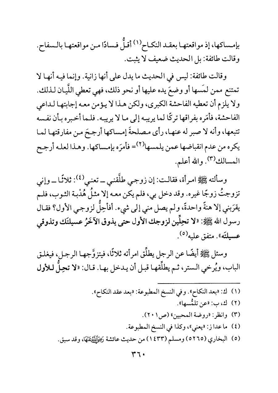 وقالت طائفة: ليس في الحديث ما يدل على أنها زانية. وإنما فيه أنها لا تمتنع ممن لمَسها أو وضعَ يده عليها أو نحو ذلك، فهي تعطي اللَّيان لذلك. ولا يلزم أن تعطيه الفاحشة الكبرى، ولكن هذا لا يؤمن معه إجابتها لداعي الفاحشة، فأمَره بفراقها تركًا لما يريبه إلى ما لا يريبه. فلما أخبره بأن نفسه تتبعها، وأنه لا صبر له عنها، رأى مصلحةَ إمساكها أرجحَ من مفارقتها لما يكره من عدم انقباضها عمن يلمسها (¬٢) = فأمرَه بإمساكها. وهذا لعله أرجح المسالك (¬٣). والله أعلم.
