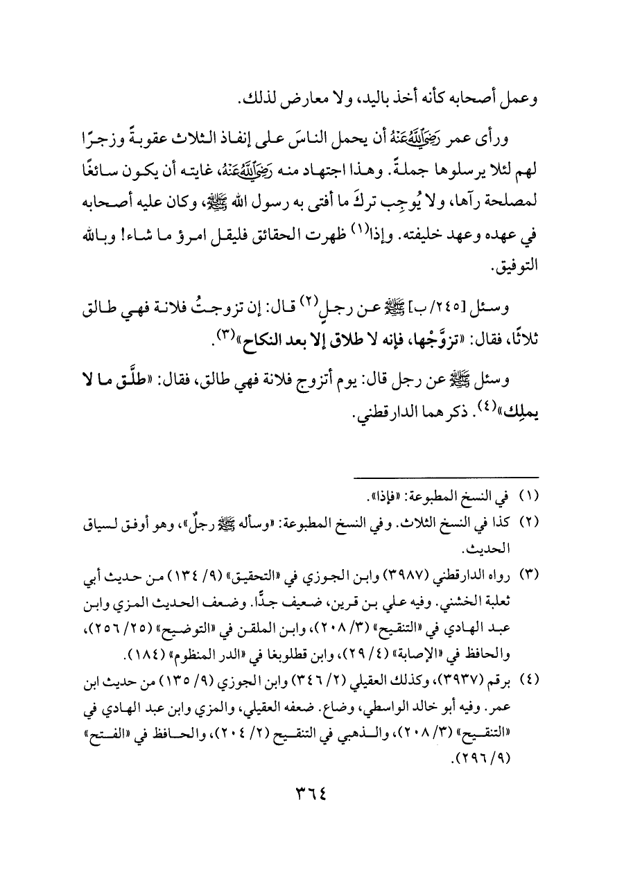 ورأى عمر - رضي الله عنه - أن يحمل الناسَ على إنفاذ الثلاث عقوبةً وزجرًا لهم لئلا يرسلوها جملةً. وهذا اجتهاد منه - رضي الله عنه -، غايته أن يكون سائغًا لمصلحة رآها، ولا يُوجِب تركَ ما أفتى به رسول الله - صلى الله عليه وسلم -، وكان عليه أصحابه في عهده وعهد خليفته. وإذا (¬١) ظهرت الحقائق فليقل امرؤ ما شاء! وبالله التوفيق.