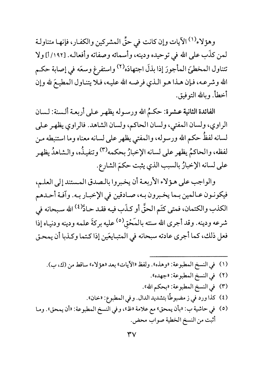 وهؤلاء (¬١) الآيات وإن كانت في حقِّ المشركين والكفار، فإنها متناولة لمن كذَب على الله في توحيده ودينه، وأسمائه وصفاته وأفعاله. [١٩٢/أ] ولا تتناول المخطئَ المأجورَ إذا بذلَ اجتهادَه (¬٢) واستفرغ وسعَه في إصابة حكم الله وشرعه، فإن هذا هو الذي فرضه الله عليه، فلا يتناول المطيعَ لله وإن أخطأ. وبالله التوفيق.
