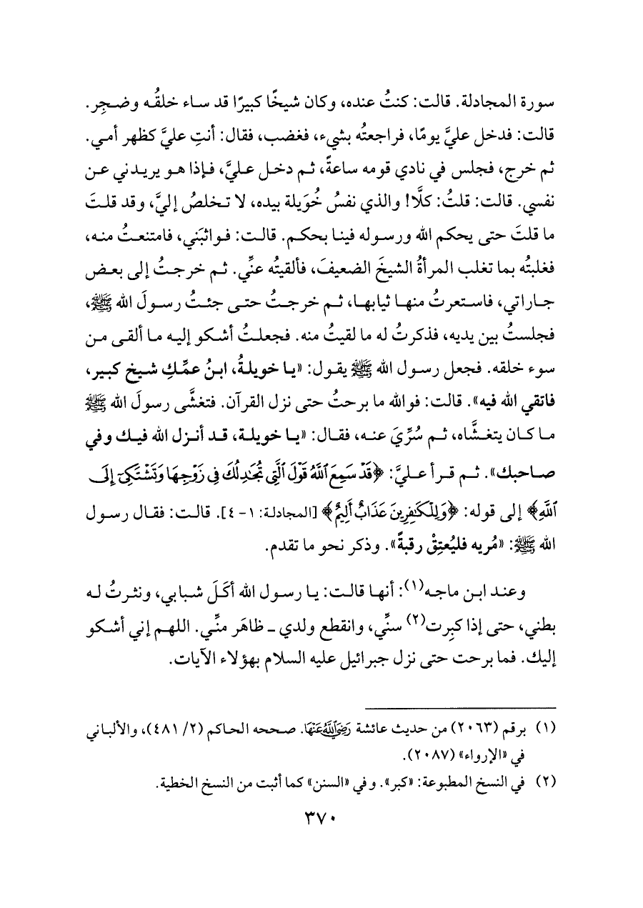 سورة المجادلة. قالت: كنتُ عنده، وكان شيخًا كبيرًا قد ساء خلقُه وضجِر. قالت: فدخل عليَّ يومًا، فراجعتُه بشيء، فغضب، فقال: أنتِ عليَّ كظهر أمي. ثم خرج، فجلس في نادي قومه ساعةً، ثم دخل عليَّ، فإذا هو يريدني عن نفسي. قالت: قلتُ: كلَّا! والذي نفسُ خُوَيلة بيده، لا تخلصُ إليَّ، وقد قلتَ ما قلتَ حتى يحكم الله ورسوله فينا بحكم. قالت: فواثبَني، فامتنعتُ منه، فغلبتُه بما تغلب المرأةُ الشيخَ الضعيفَ، فألقيتُه عنِّي. ثم خرجتُ إلى بعض جاراتي، فاستعرتُ منها ثيابها، ثم خرجتُ حتى جئتُ رسولَ الله - صلى الله عليه وسلم -، فجلستُ بين يديه، فذكرتُ له ما لقيتُ منه. فجعلتُ أشكو إليه ما ألقى من سوء خلقه. فجعل رسول الله - صلى الله عليه وسلم - يقول: «يا خويلةُ، ابنُ عمِّكِ شيخ كبير، فاتقي الله فيه». قالت: فوالله ما برحتُ حتى نزل القرآن. فتغشَّى رسولَ الله - صلى الله عليه وسلم - ما كان يتغشَّاه، ثم سُرِّيَ عنه، فقال: «يا خويلة، قد أنزل الله فيك وفي صاحبك». ثم قرأ عليَّ: {قَدْ سَمِعَ اللَّهُ قَوْلَ الَّتِي تُجَادِلُكَ فِي زَوْجِهَا وَتَشْتَكِي إِلَى اللَّهِ} إلى قوله: {وَلِلْكَافِرِينَ عَذَابٌ أَلِيمٌ} [المجادلة: ١ - ٤]. قالت: فقال رسول الله - صلى الله عليه وسلم -: «مُريه فليُعتِقْ رقبةً». وذكر نحو ما تقدم.