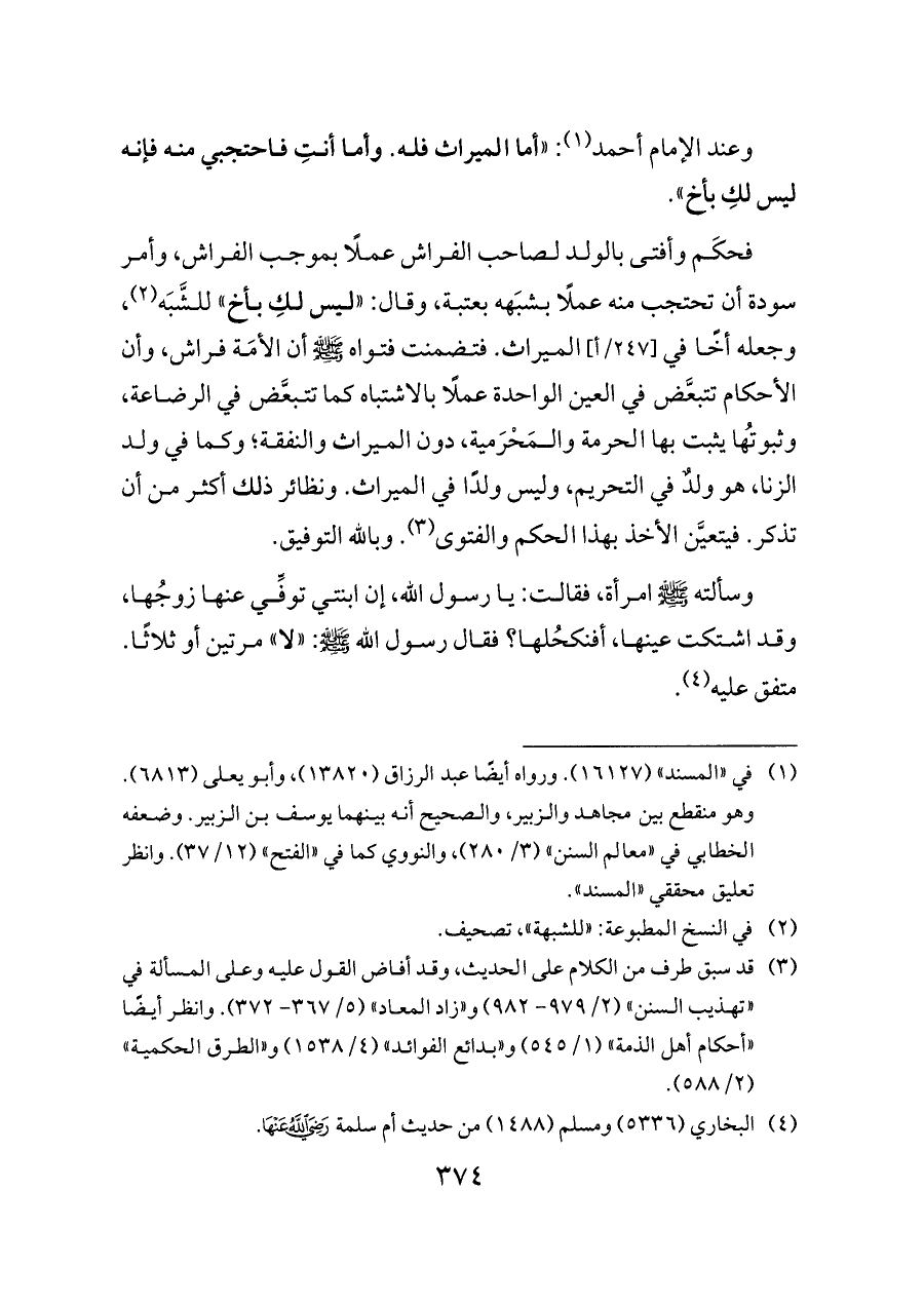 فحكَم وأفتى بالولد لصاحب الفراش عملًا بموجب الفراش، وأمر سودة أن تحتجب منه عملًا بشبَهه بعتبة، وقال: «ليس لكِ بأخ» للشَّبَه (¬٢)، وجعله أخًا في [٢٤٧/أ] الميراث. فتضمنت فتواه - صلى الله عليه وسلم - أن الأمَة فراش، وأن الأحكام تتبعَّض في العين الواحدة عملًا بالاشتباه كما تتبعَّض في الرضاعة، وثبوتُها يثبت بها الحرمة والمَحْرَمية، دون الميراث والنفقة؛ وكما في ولد الزنا، هو ولدٌ في التحريم، وليس ولدًا في الميراث. ونظائر ذلك أكثر من أن تذكر. فيتعيَّن الأخذ بهذا الحكم والفتوى (¬٣). وبالله التوفيق.