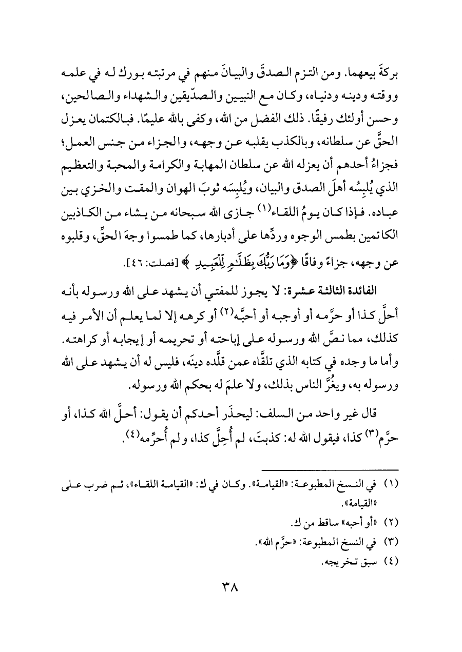 الفائدة الثالثة عشرة: لا يجوز للمفتي أن يشهد على الله ورسوله بأنه أحلَّ كذا أو حرَّمه أو أوجبه أو أحبَّه (¬٢) أو كرهه إلا لما يعلم أن الأمر فيه كذلك، مما نصَّ الله ورسوله على إباحته أو تحريمه أو إيجابه أو كراهته. وأما ما وجده في كتابه الذي تلقَّاه عمن قلَّده دينَه، فليس له أن يشهد على الله ورسوله به، ويغُرَّ الناس بذلك، ولا علمَ له بحكم الله ورسوله.