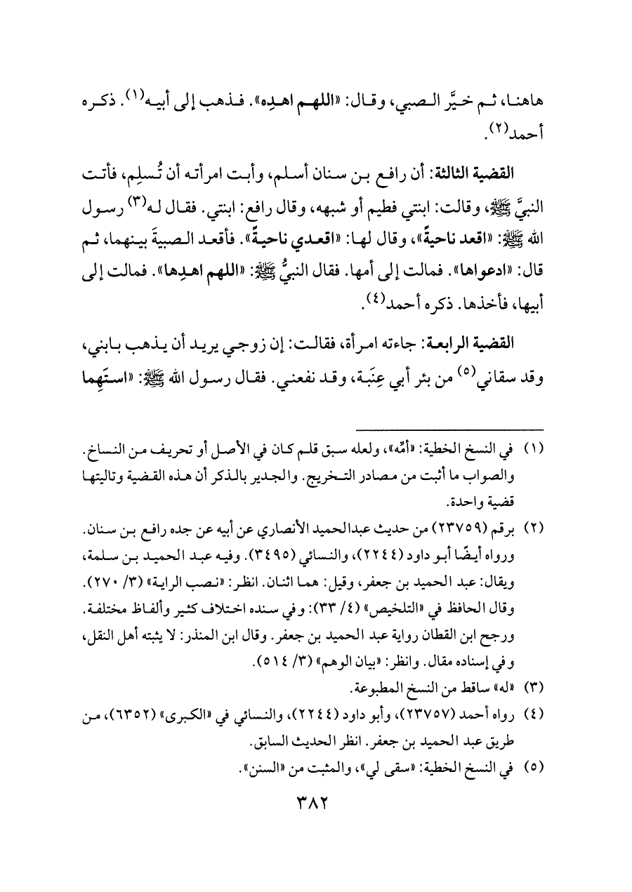 القضية الثالثة: أن رافع بن سنان أسلم، وأبت امرأته أن تُسلِم، فأتت النبيَّ - صلى الله عليه وسلم -، وقالت: ابنتي فطيم أو شبهه، وقال رافع: ابنتي. فقال له (¬٣) رسول الله - صلى الله عليه وسلم -: «اقعد ناحيةً»، وقال لها: «اقعدي ناحيةً». فأقعد الصبيةَ بينهما، ثم قال: «ادعواها». فمالت إلى أمها. فقال النبيُّ - صلى الله عليه وسلم -: «اللهم اهدِها». فمالت إلى أبيها، فأخذها. ذكره أحمد (¬٤).